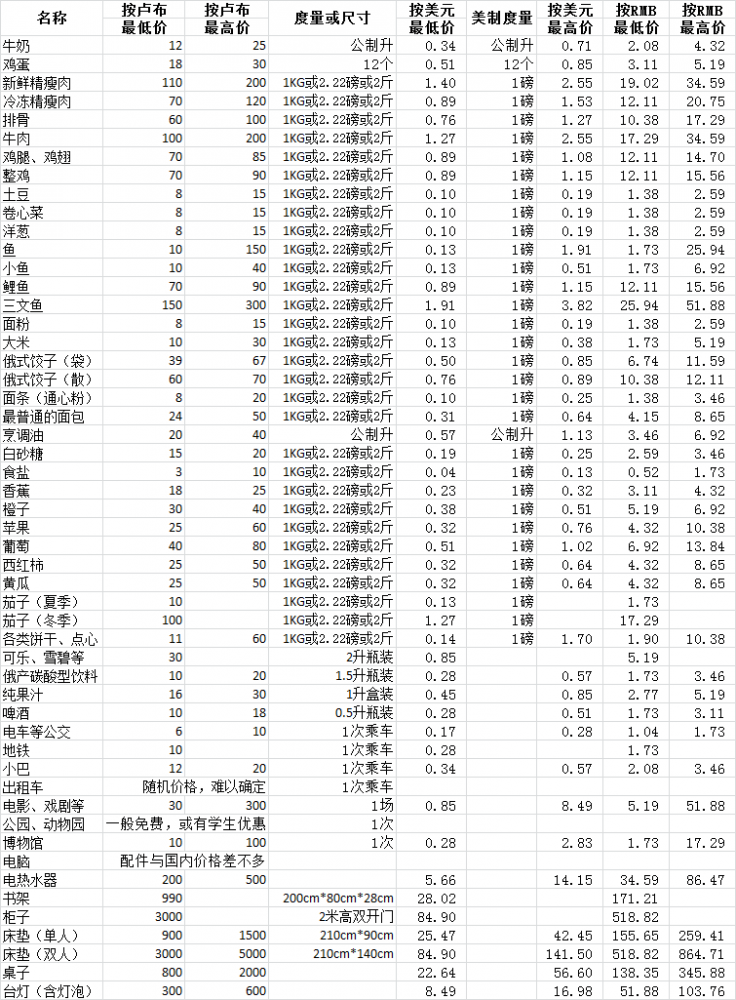该报道说,2013年莫斯科地区的家庭收入平均20000~30000卢布/月,或566~849美元/月,或3459~5188元RMB/月,全国最高。多数俄国城市只有这个数字的一半到1/3。下面以表格方式列出三国货币单位的俄罗斯圣彼得堡市的部分物价。