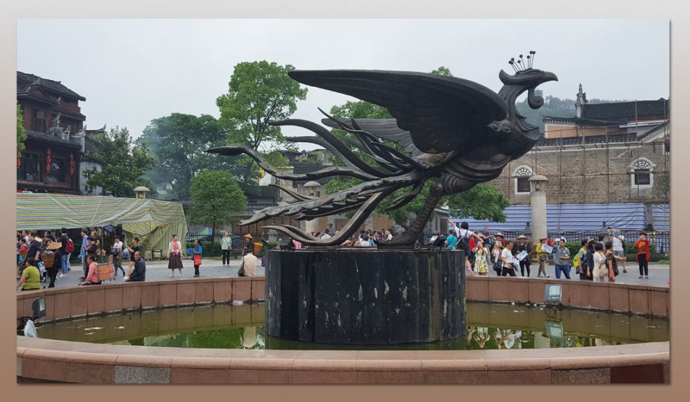走着,看着,吃着,不知不觉就到了开阔的凤凰广场,广场正中,腾飞着一只国画大师黄永玉笔下的凤凰,这个古城的符号。这只用古铜铸成的凤凰,栩栩如生,我在想,它黝黑的躯体,一定沉淀着历史的淤积,背负着很多古城的故事。