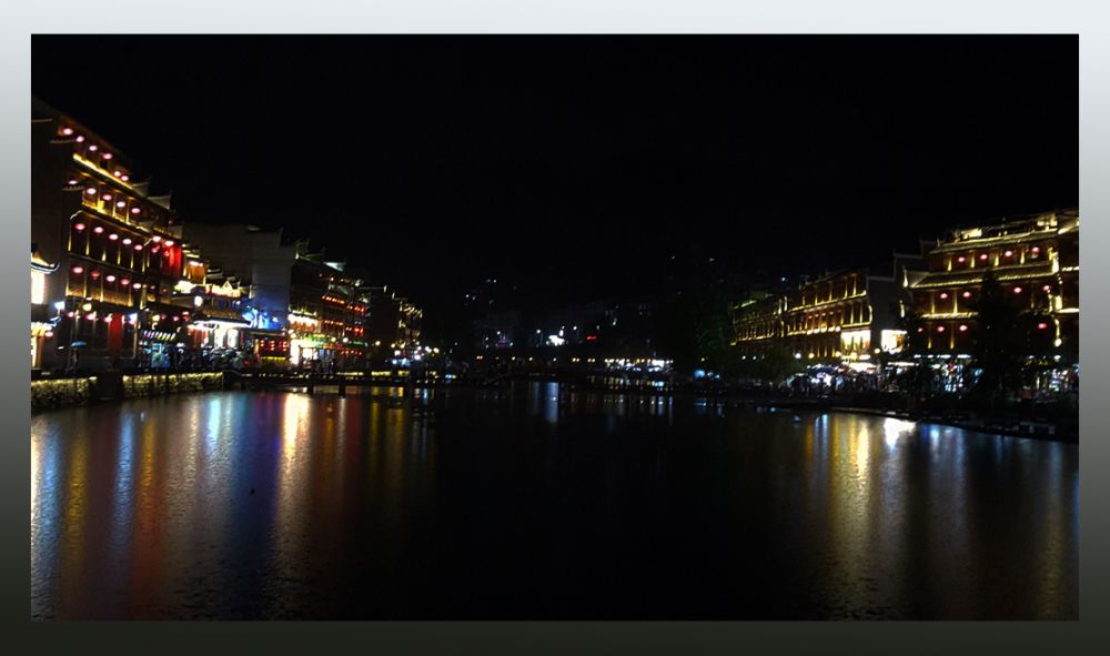 夜幕下的凤凰,又是另一番令人惊艳的景致。沱江边木楼内射出的霓虹彩灯,在平静的江水里倒影出一柱柱璀璨的光影,虚实间,令灯火阑珊的古城蒙上一层梦幻的绚烂,仿佛给朴实无华的凤凰,披上了一身华丽的彩衣。然而,我相信,当短暂的光芒黯淡后,凤凰,依然是那一只承载着古城历史,灵动秀丽,古朴的凤凰。