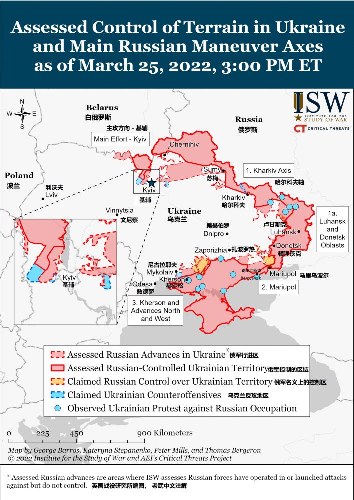 俄罗斯攻占乌克兰基辅的计划完全失败,对距离俄国不到50公路的第二大城市哈尔科夫(Харк?в, Kharkiv)也是久攻不下。 对乌克兰南部重镇马里乌波尔(Мар?уполь, Mariupol)这个50万人口的城市仍未拿下。这个城市在全面包围,整个城市已经没有一个完整的建筑, 已经两周以上断水断电,目前仍然顽强地坚守者。