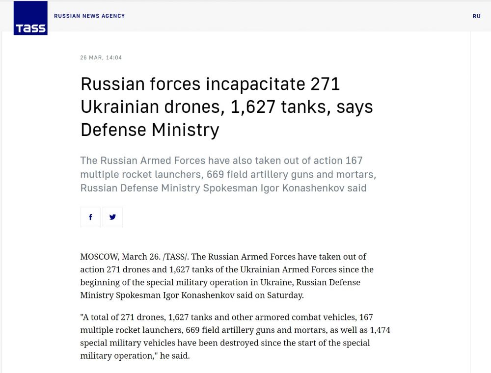 关于俄乌双方的战报,乌克兰比较透明,栏目比较详细,每天都有更新,这样读者如果结合当日的消息便能区分起真伪。 俄罗斯方面则不常更新,而且比较笼统。 乌克兰方面的今天的战报公布,俄军被击毙的人数为16600,伤亡总数在3-4万。 3月25日俄罗斯官方公布的伤亡是1351阵亡,3825人受伤。 这个数字显然偏低,因为俄罗斯共青团真理报3月21日一不小心公布的从国防部得到的数据是 9,861死亡,16,153负伤。 本人认为乌克兰公布的俄军伤亡人数虽然有夸大的成分,但还是比较靠谱。 这里有两点依据, 其一, 3月23日, 北约根据乌克兰提供的数据估计俄军死亡人数高达15800, 伤、亡、被俘、失踪的总数达40000; 其二, 几天前俄乌双方交换俘虏,乌方交还的俄军士兵为500,而俄方交还的乌军士兵只有50, 10:1的战俘比例说明俄军的损失远比乌军惨重。