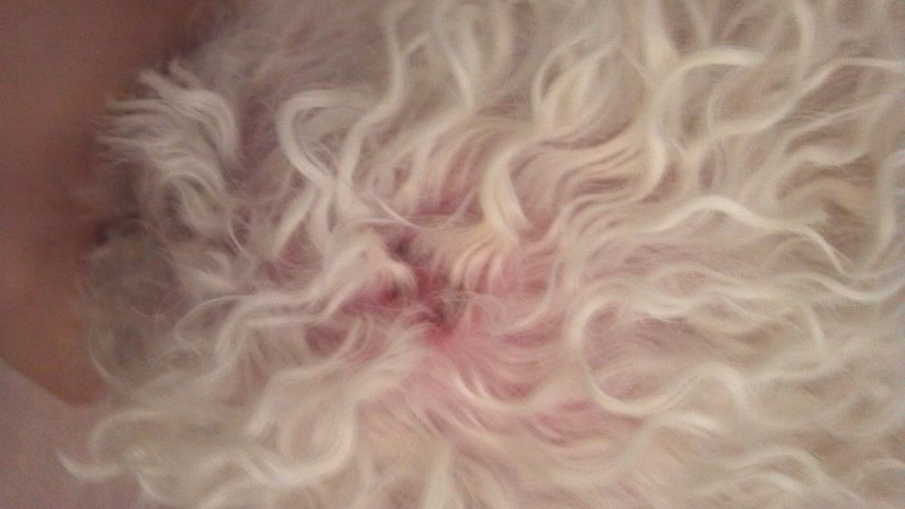 半小时后,我放好温水,抱它洗澡,但它仍然不配合,我耐心地边哄边夸,我一般是从后面尾巴处开始往头部洗,当最后洗到头时,头部的毛发见水会沾缩一起,这样就会显露出头皮,这时我竞意外发现显露出的头皮上有伤痕(见下面图片),当时心就一紧,仔细观察,伤痕附近的毛根处还有血丝和血痂,想到一周多前,曾听到它在外面厅房惨叫,但今天这个伤痕却象是三天之内的新伤口,不知它离开我的有效看护时,又曾受了多少伤害,想到这,眼泪就下来了,这时Eevee也乱动的厉害,根本不让我去碰伤痕处,我强忍泪水,帮它洗完,吹干。为了能方便上药,我把伤痕边的毛发剃掉,然后发现,此伤痕有四个出血点(见下面图片)。