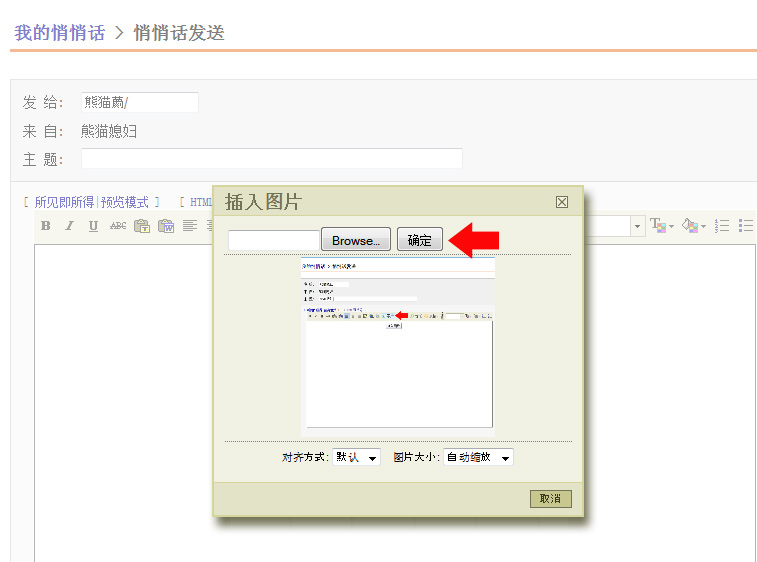 登陆后,到私房主页,点击任何一版主的名字,发送悄悄话。 主题标明是参加活动。 帖图时,点击下图红箭头指的图标。