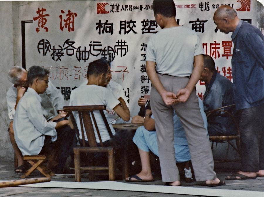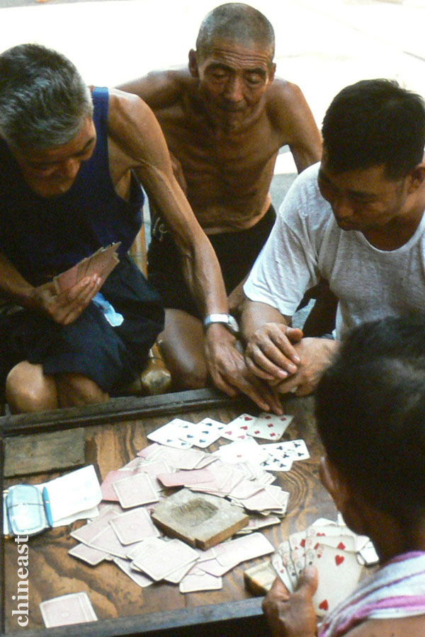 六个人, 两付牌, 一张小桌六把小凳子或椅子,“档次不高”, 不像桥牌那么高雅, 但确实是街头巷尾爷叔伯伯老阿姨, 翘脚麻皮小癞痢,都能玩得上劲的平民娱乐, 当然退休人员最为起劲。