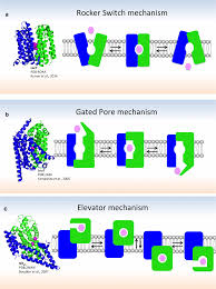 如下图所示, Forrest 在2011年综述总结了两个。 一种是Rocker Switch. 就是蛋白质的蓝绿两扇门一开一合, 实现对外对内的轮流。 这一模型的要点是葡萄糖在蛋白里的结合位点在“纬度”上是不动的。