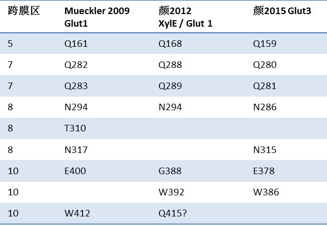 科学地讲,就是转运蛋白的底物特异性。 这个问题简单回答就是, 蛋白质需要在特定的位置有特定的氨基酸。 这些位点一般比较“保守”--即功能相似但不同的蛋白基本都有这些或者性质类似的氨基酸。 2009年Meuckler对GLUT1的研究就总结了这个糖蛋白的结合位点。 大部分在颜2012与2015都得到了证实(见下表), 但也有被晶体结构“否定”或 质疑的,这反映了大家某些地方还在“摸象“和科学进步中的不确定性。再下面的课题有两个。 1。为什么这些氨基酸决定了蛋白的特异性? 第二个问题是蛋白质与葡萄糖结合后如何发动转运。 现在给读者留一个小题目:为什么这个表里没有颜2014?