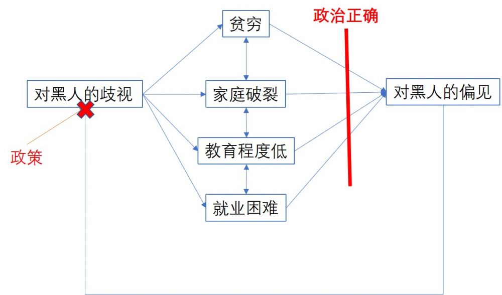 在弗洛伊德一案引起的争论中,我们经常看到把黑人的落后归结为教育,家庭,不上进等等因素。 要知道,对一个个人来讲, 个人的努力也许能改变不少, 但是对于一个种族的整体, 我们就不得不考量外界的因素。从南北战争到种族隔离,这些系统性的歧视与压迫导致黑人作为整体起点就极低,没有财产, 没有教育,没有家庭。 而这些因素互相作用,互相影响, 并且更加加深人们的偏见,加深社会对黑人的系统性歧视。 造成恶性循环 (见下图)。 我们要从根本上解决问题, 第一步就是通过制度的改革消除系统性的歧视与并通过政治正确, 消除偏见。 政治正确在过去也许又过激的,近年来被丑化。 但实际上, 政治正确在消除与防止偏见上起到着重要的作用。 如同Al Sharpton说的那样:”Get Your Knee Off Our Knecks”!