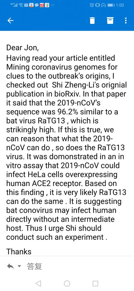 刚才看到城头文章:肆虐武汉的新冠状病毒可能是实验室外泄的吗link:https://s3.shbox.workers.dev/news/2020/02/05/9096975.html我对于文章里华人科学家X的观点不尽同意,RaTG13和2019-nCoV虽然差了1100bp,人工改造获得感染人细胞的技术是成熟的,目前不难做到,而且所需时间比自然进化所需的25-65年短的多。另外,RaTG13和2019-nCoV在S蛋白上高度同源,提示RaTG13也许不需要中间宿主就能直接感染[