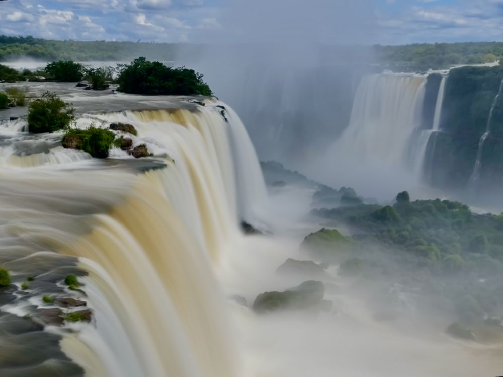 伊瓜苏瀑布位于阿根廷与巴西交界的热带雨林地区。去年春天随友人一行游览了这世界最宽阔壮美的大瀑布。一年多的时光流逝丝毫没有改变伊瓜苏留给我的深刻记忆。地球上南美洲翠绿的热带雨林中的伊瓜苏瀑布像一条银色的巨龙奔腾咆哮撼天动地。记得那天我披着雨衣站在伊瓜苏瀑布下的观景台上被眼前惊天动地的大瀑布所震撼。