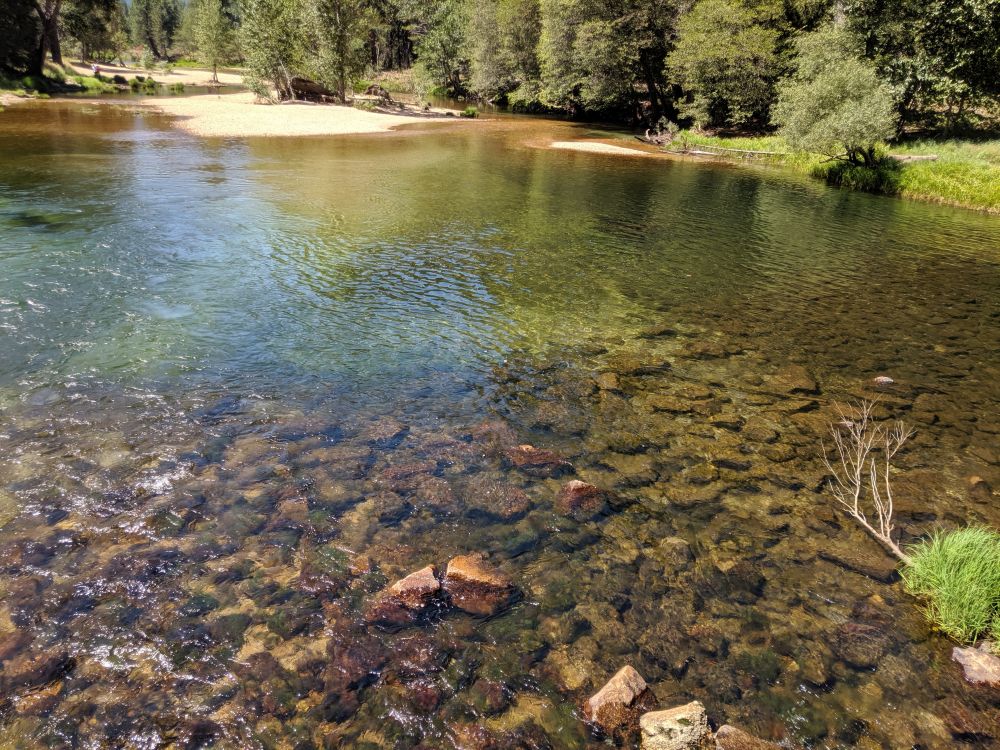 下了shuttle bus,走了大约一迈就到了湖边。也许因为枯水季节,Mirror Lake分成了一个一个的水潭。人们在湖边分散开,很多孩子从巨大的石头上跳进湖里,有的人踩着裸露的石头走到了对岸。我们继续沿着trail向前走。脚下是砂石路。玲告诉我他们专门要在这样的路上训练,因为必须全神贯注。一直走到一座石壁山的脚下,山下都是滚落的乱石,如同一座天然的采石场。在往前又走了一段水冲出来的卵石路。路上时而笼着树影的清凉时而透出阳光的明亮。脚下的溪水声和头顶的松涛声消失又升起交织又分散。一幅有声有色的图画。