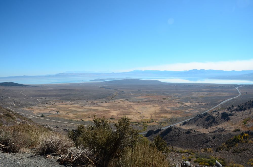 在路边停下的第一站。远方的山、崖底的石滩以及水坝。