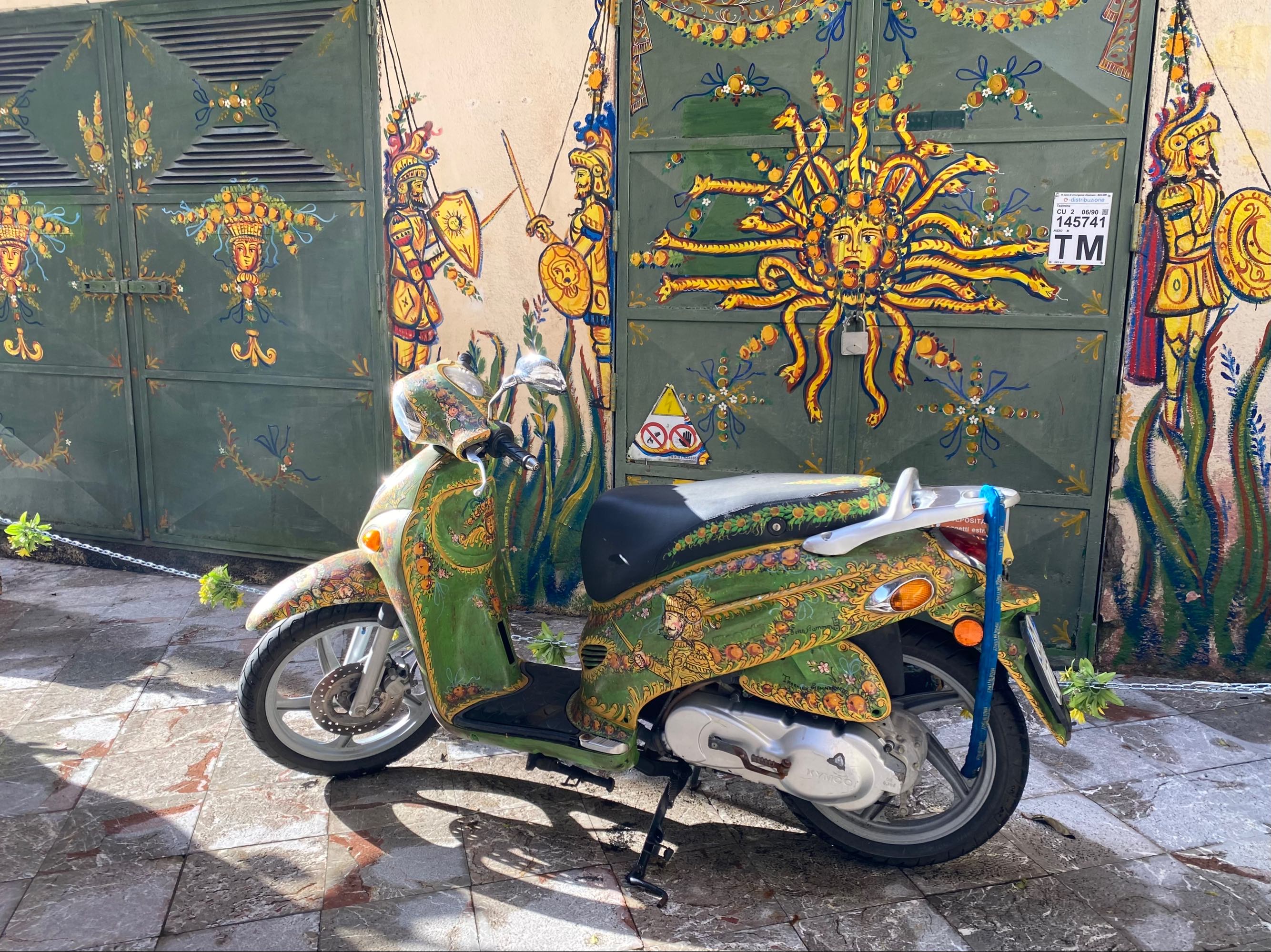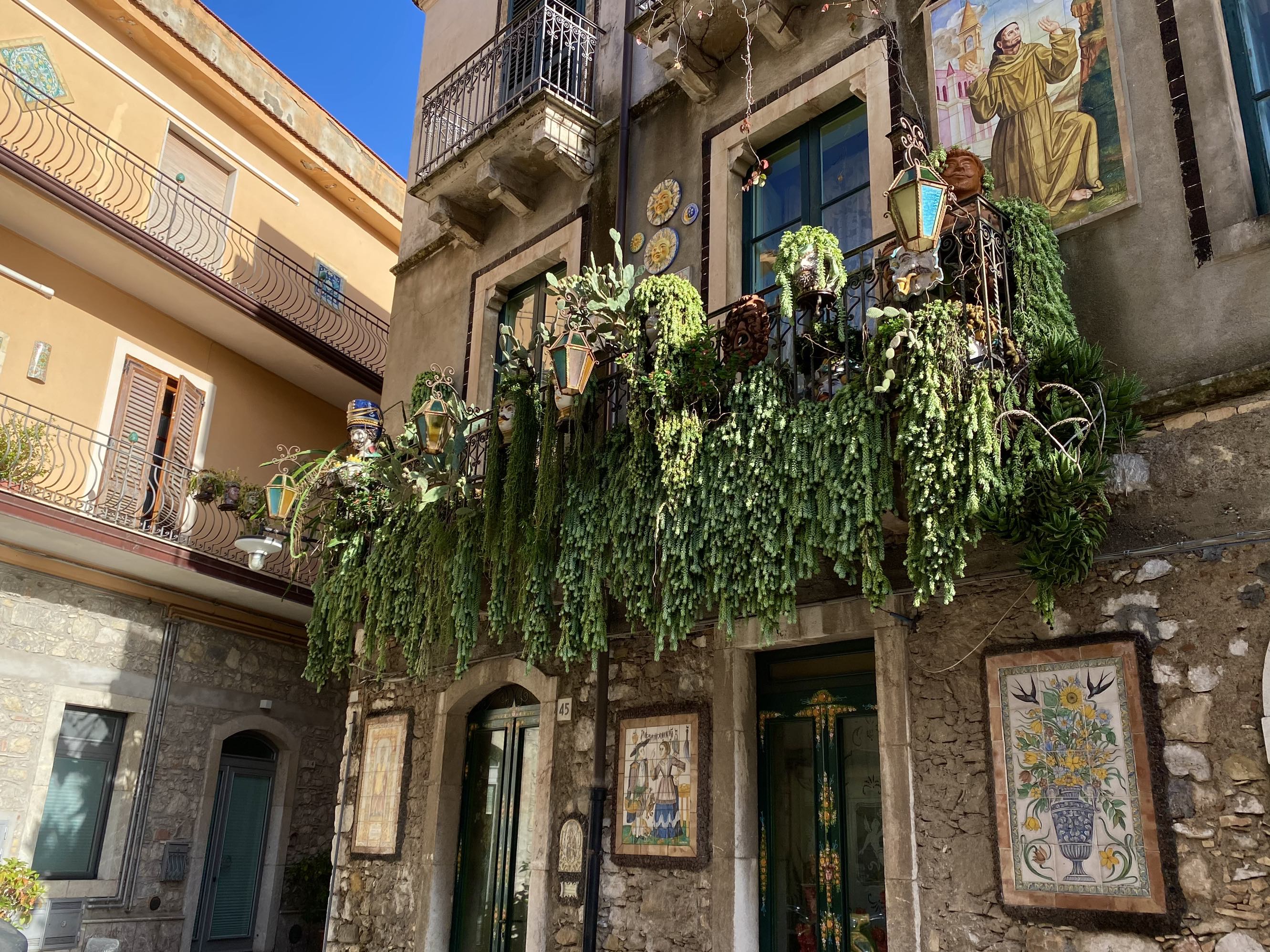 墙上挂有堪称西西里图腾的三腿美杜莎女神陶瓷,当地称为Trinacria,意指三角形,由于西西里岛是个三角形岛屿,她的三条腿分别指向岛的三个角,代表守护着这座岛屿…