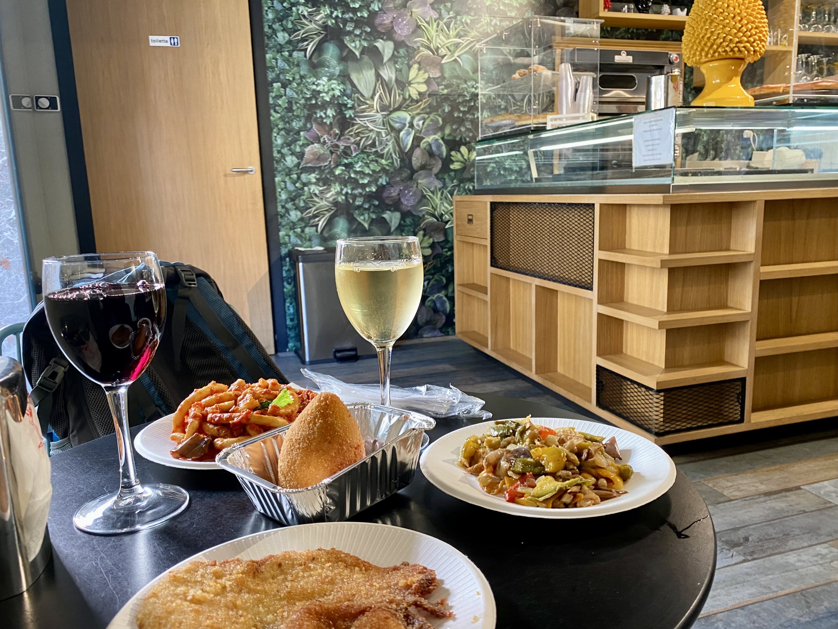这家街边店我们很是喜欢,吃Lunch特别合适,有点类似自选餐,各种小菜自己挑,当然得来一客西西里特色小吃Arancini炸饭团,再来两杯西西里美酒,在意大利时光就是这么打发的… 哈哈