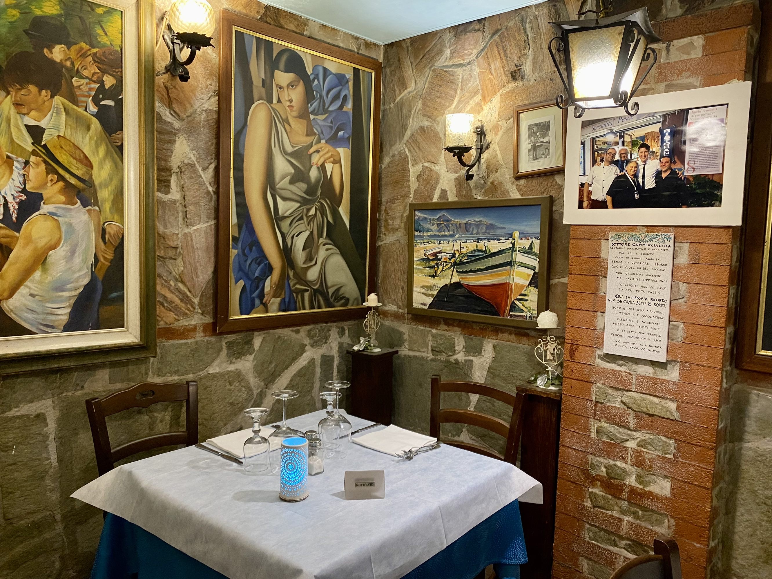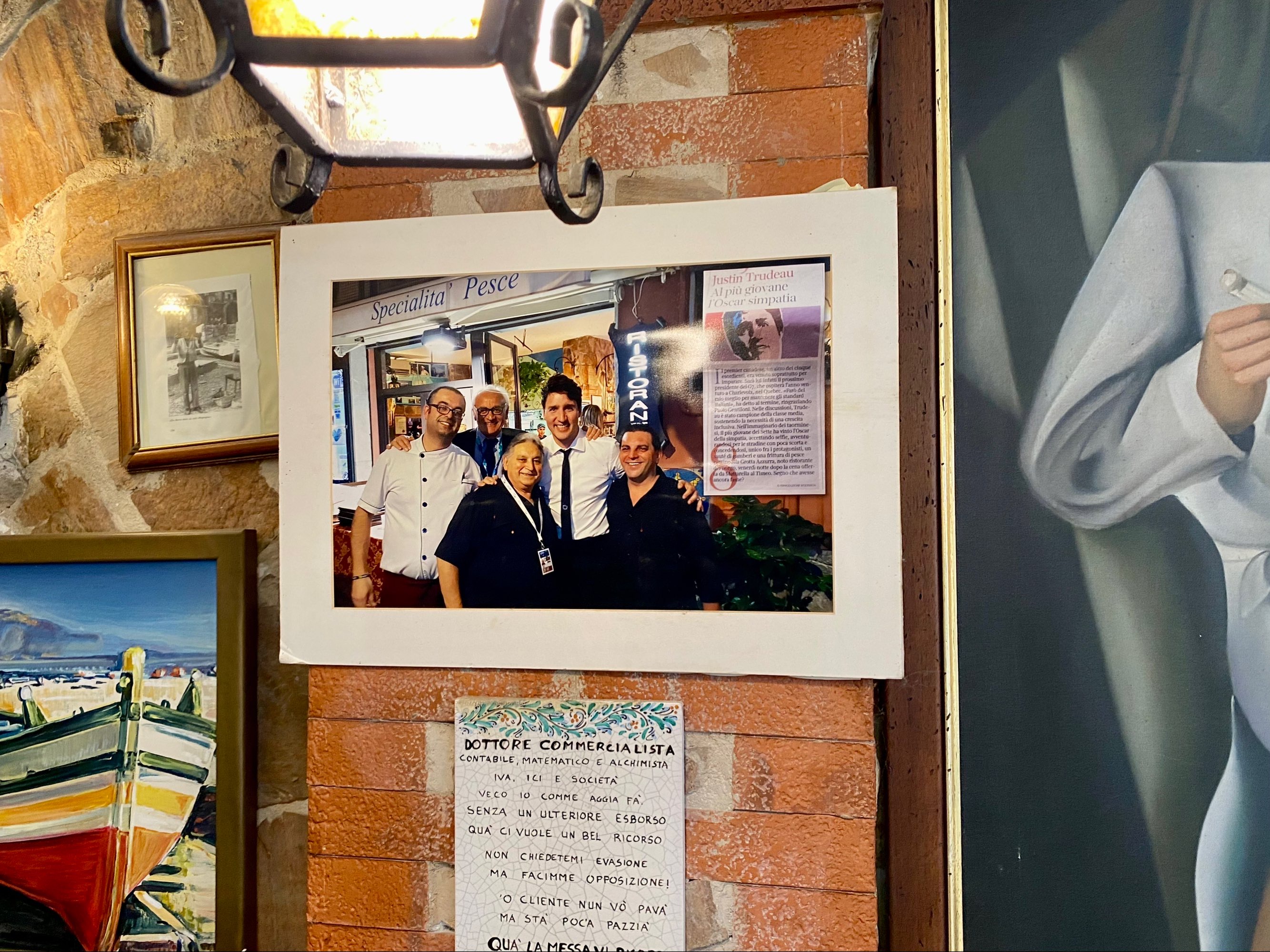 原来2017年G7峰会在陶美娜举办时,当时小土豆率一众随从果然是光顾了他家的餐厅,这可是太有缘分了,老头子就乘机说今晚就来我家用餐吧,我把这张位置最佳的餐桌预留给你们,原本酒店已为我们推荐了另一家餐厅的,可就凭这缘分也得来他家啊…