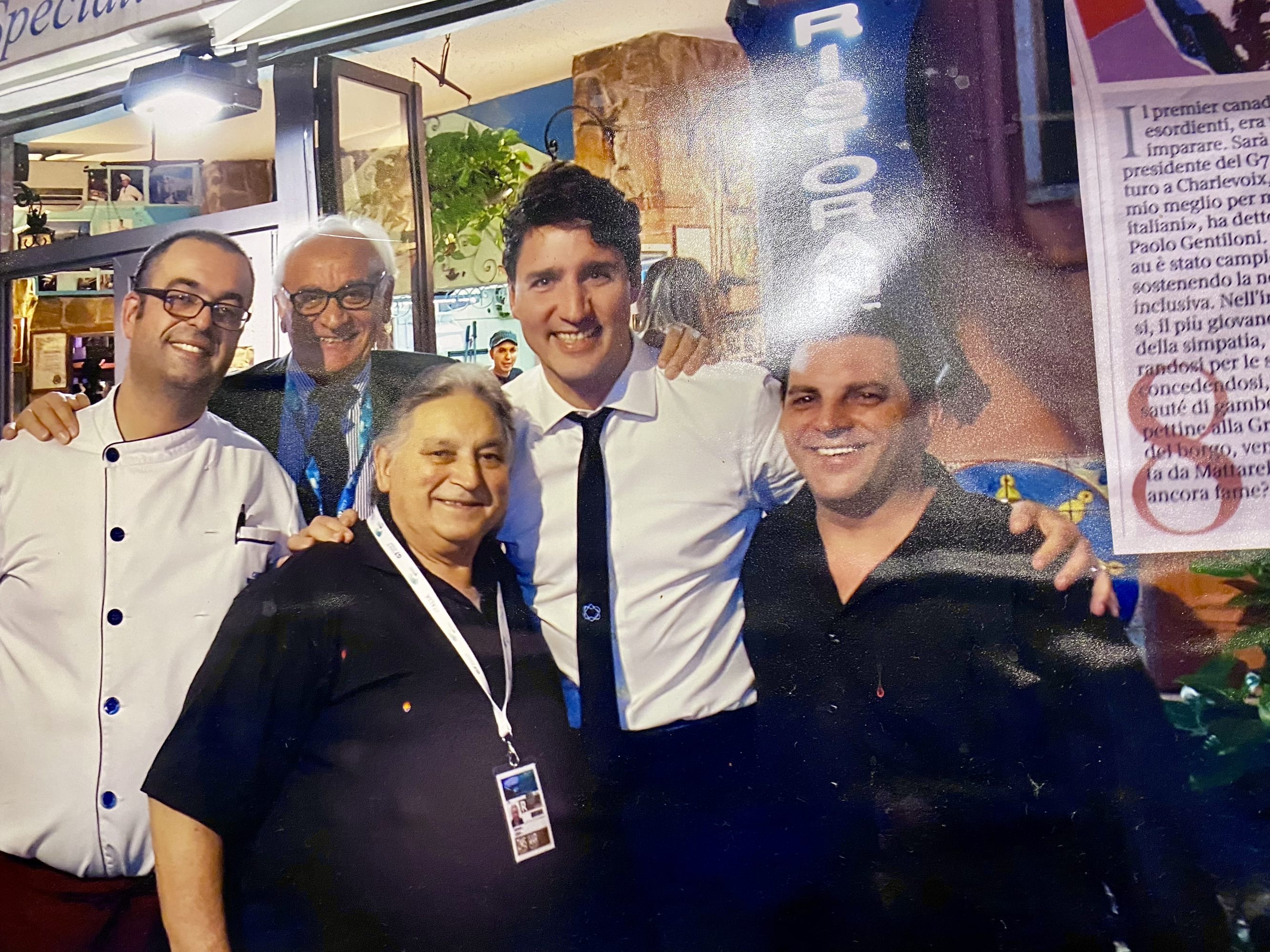 怕我们不信,老头子便邀我们进店里看他跟加国总理小土豆(小杜鲁多)的合影,这可太有意思了,他家餐厅最好的餐桌旁还真是挂着杜鲁多跟他们在店里的合影,小土豆右手搂着就是老板本人,左手搂着的是老板的儿子…