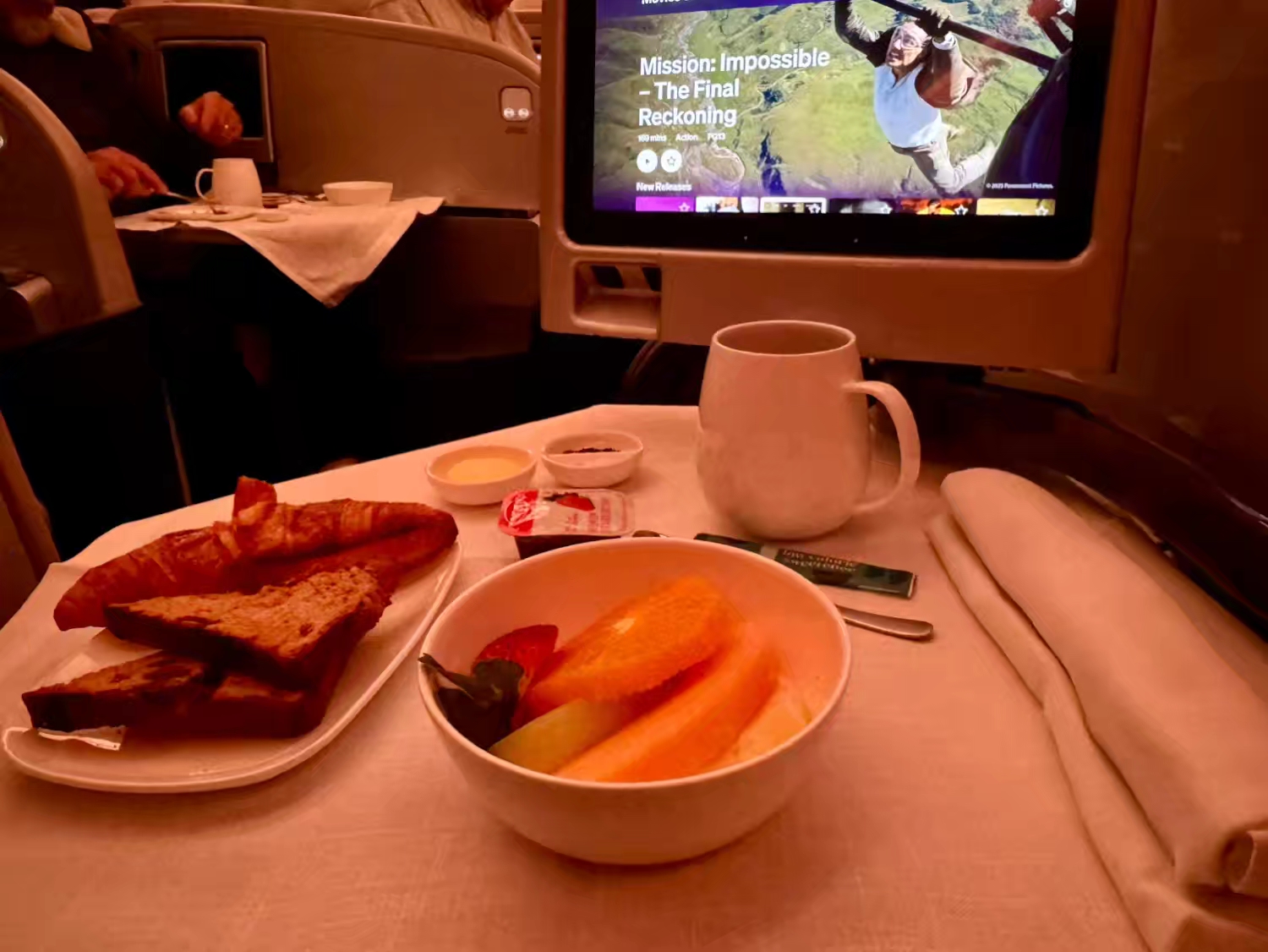 餐饮方面就不多说了,反正跟法航完全没得比,甚至感觉比加航还差一些,每道菜都齁咸,面包硬邦邦的,香槟不是法国产的,是新西兰自产的气泡酒,这在全球主流航司的商务舱都是少见的,跨太平洋航班本来就比跨大西洋少得多,价位还要翻上不止一倍,连法国香槟都没有,多少有点意外,吃饭的时候更是一点私密性都没有,不得不把屏幕掰过来遮挡一下~