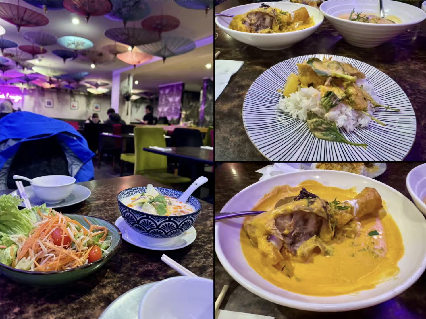 当晚我们就在皇后镇街上选了一家泰国餐厅庆生,没想到在那里吃到了此行最惊艳的一道菜——帕南咖喱小羊腿(Panang Curry Lamb Shank),香浓入味、酥烂可口,配上正宗的木瓜沙拉,美味极了!在这里还发生了一个值得一提的小插曲,因为新西兰纽币的颜色和欧元有点像,我第一次结账时居然把一张100欧元当成100纽币付了出去。没想到前台小姐追出来还钱,微笑着提醒我给错了,挺令人感动的。那一刻真切感受到新西兰人的诚实与善良,其实许多在餐厅工作的年轻人都是持工作签证的各国年轻人,却个个真诚友善,让人倍感温暖~ 后来我们在南岛环游一圈回到皇后镇时,还特地又回到这家餐厅,再次点了这道念念不忘的美味~