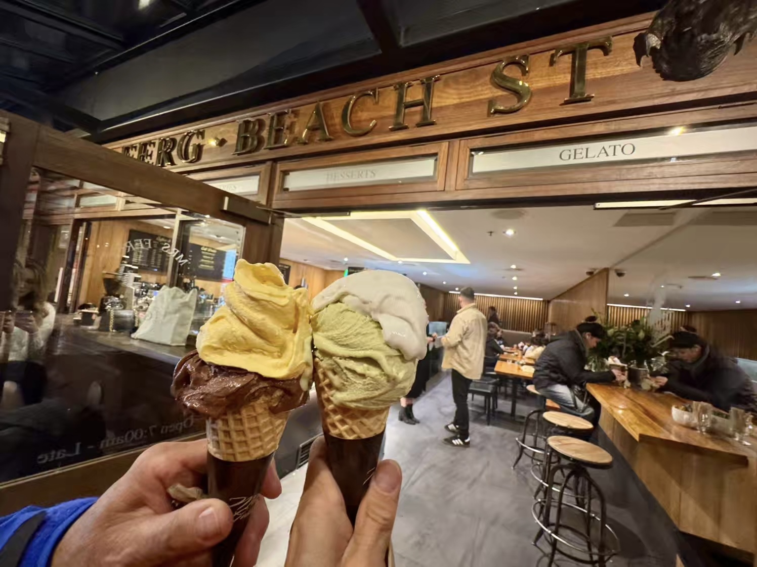 饭饱酒足后,我们又在皇后镇街上闲逛,偶然发现了一家意式冰淇淋(Gelato)店。天哪,那一刻仿佛回到了年初在法国的Chamonix霞莫尼滑雪时的情景,我们立刻点了两支甜筒,作为餐后甜点,新西兰的Gelato品质出乎意料地好,丝滑浓郁,可说是我们在欧洲以外吃到的最美味冰淇淋,完全可以和阿根廷的Gelato相媲美!