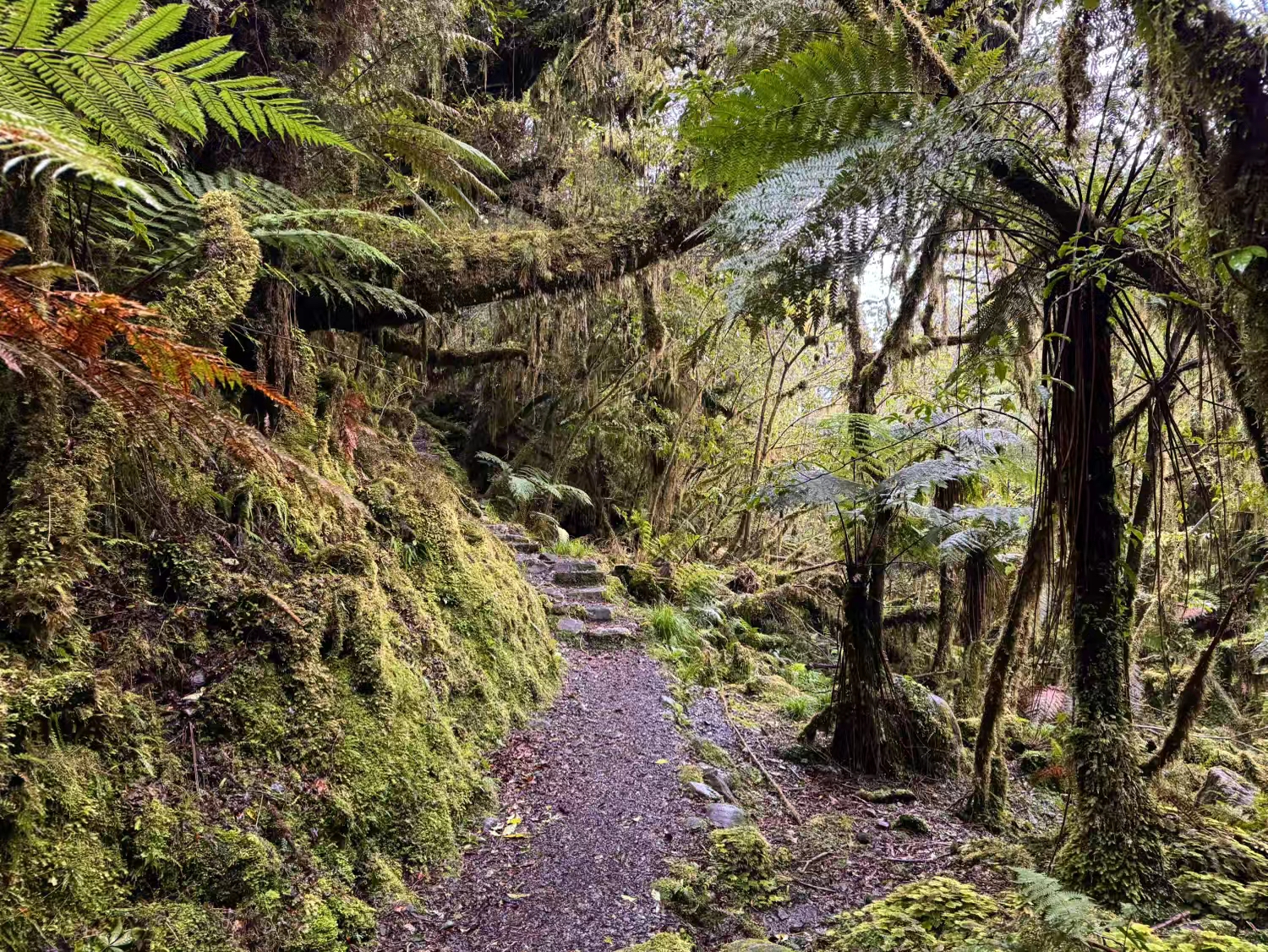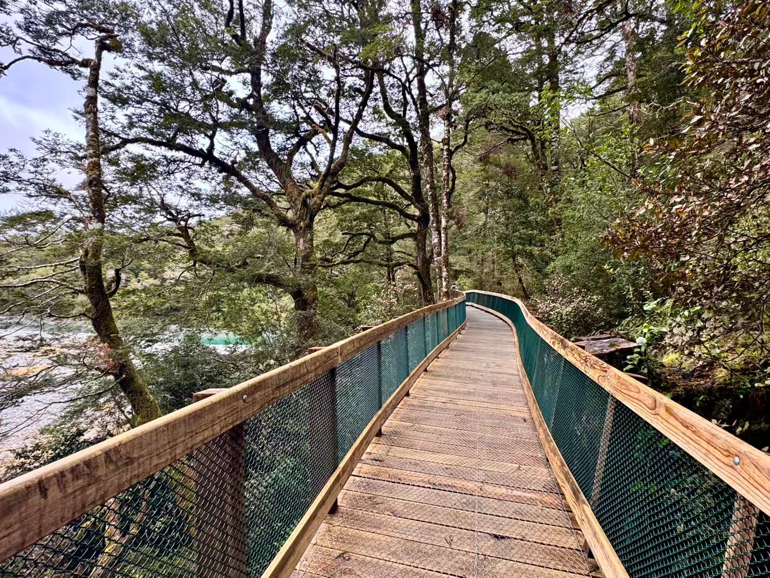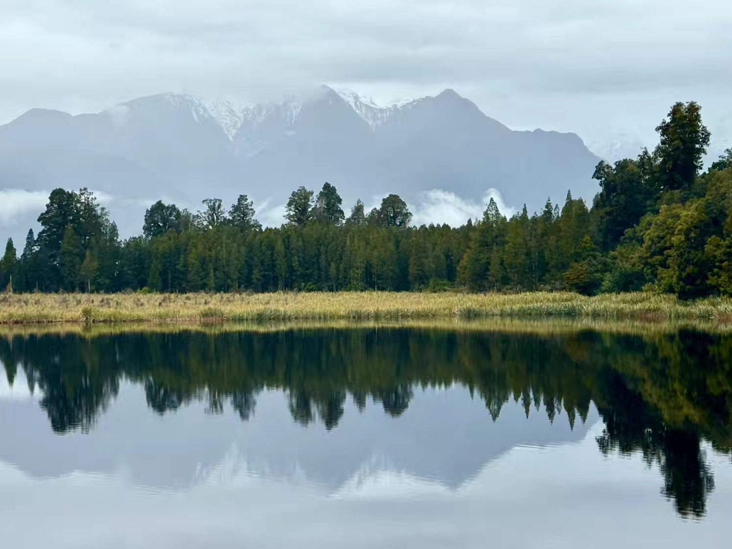 结束了 Fox Glacier 的徒步后,我们回到房车里简单吃了个午餐,休息了一下,下午就去了附近的 Lake Matheson 走一段轻松的短途步道。这里本来是一个很有名的“镜面湖”,天气好的时候,湖面像一面镜子一样,可以清楚地倒映出对面的雪山,甚至还能看到新西兰南岛的最高峰 - 库克山。