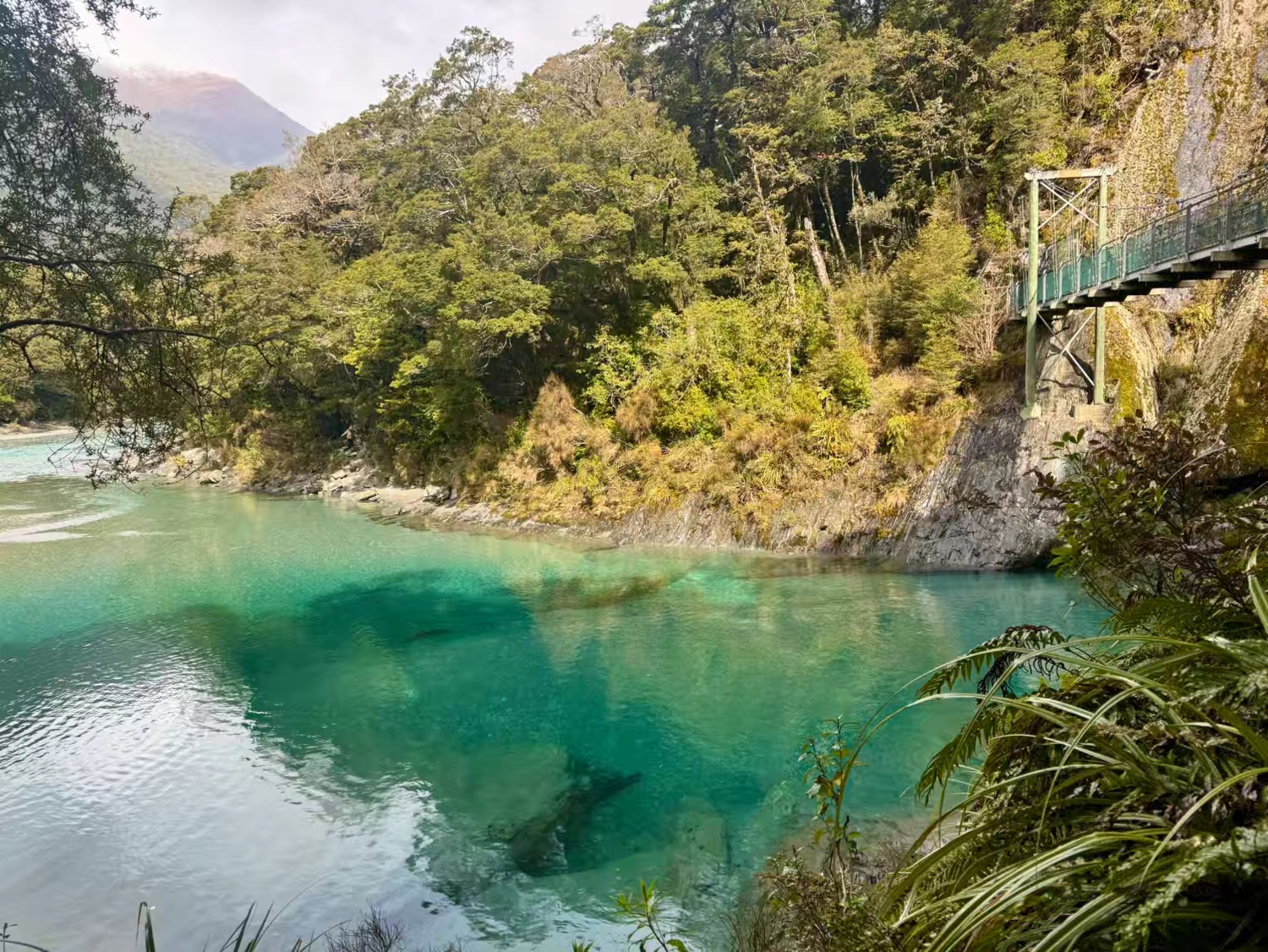 离开瓦纳卡湖区,向南岛西海岸进发,一路上雪山美湖的无限风光自不必说,而南岛的另一大看点就是这里的水色,第一个不能错过的景点就是这个叫 Blue Pool(蓝池)的地方,从停车的地方徒步大约一个小时就能抵达,一路上的步道维护得也相当不错…
