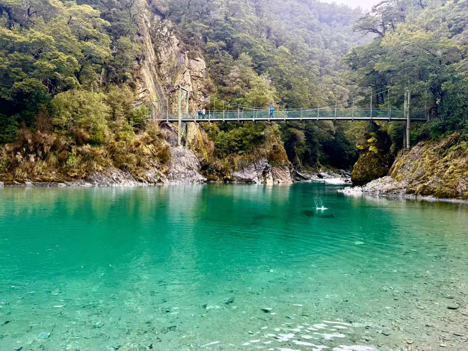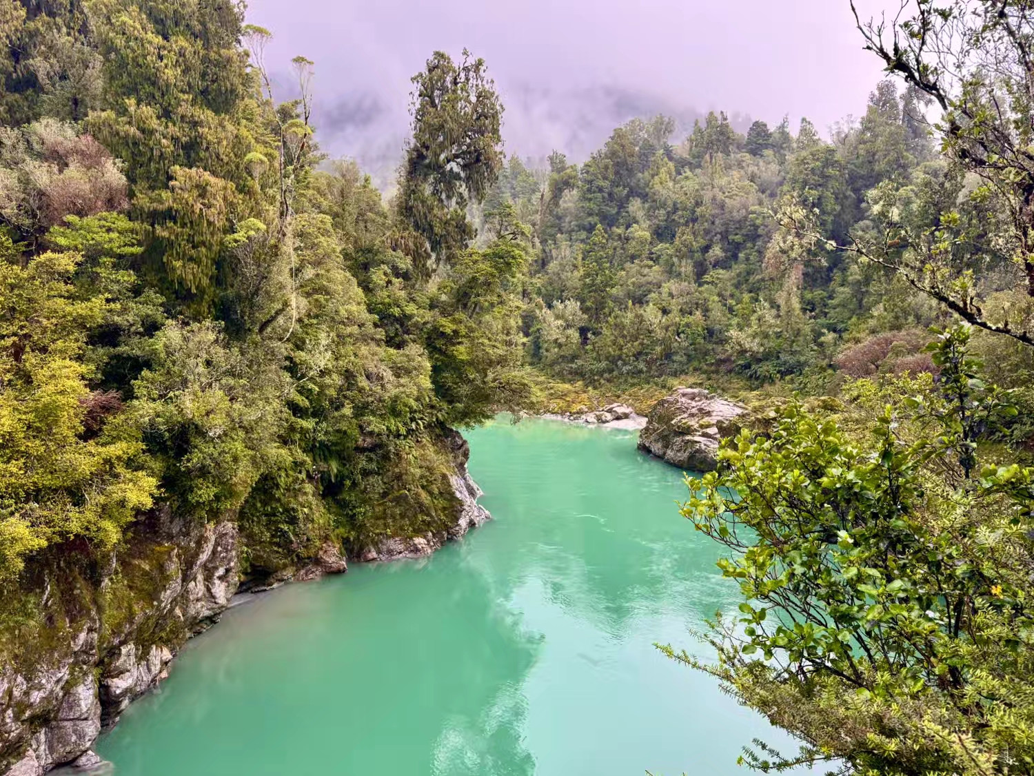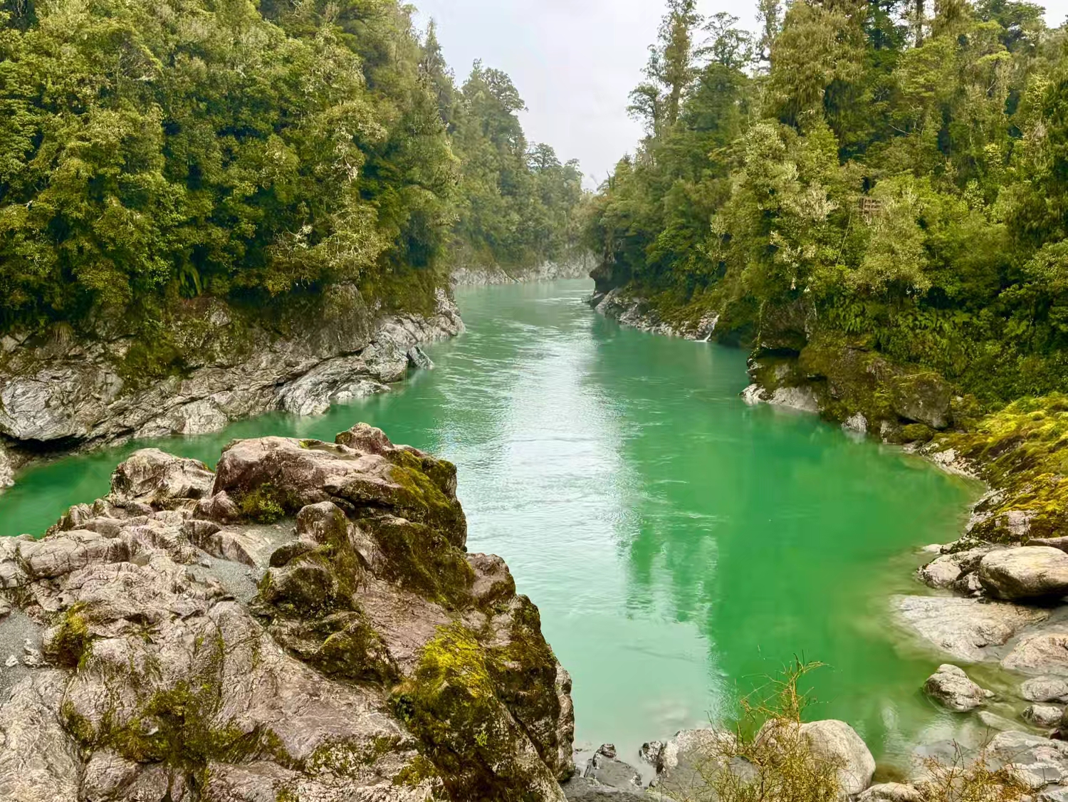 接着我们又来到了这个叫霍基蒂卡峡谷的蓝湖(Hokitika Gorge)原本传说这里的水应该是梦幻的牛奶蓝,结果因为赶上阴天,看起来呈偏绿色,倒给人一种安静又清澈的感觉,也别有味道,就像大自然在低声细语,不用张扬,却足够迷人…