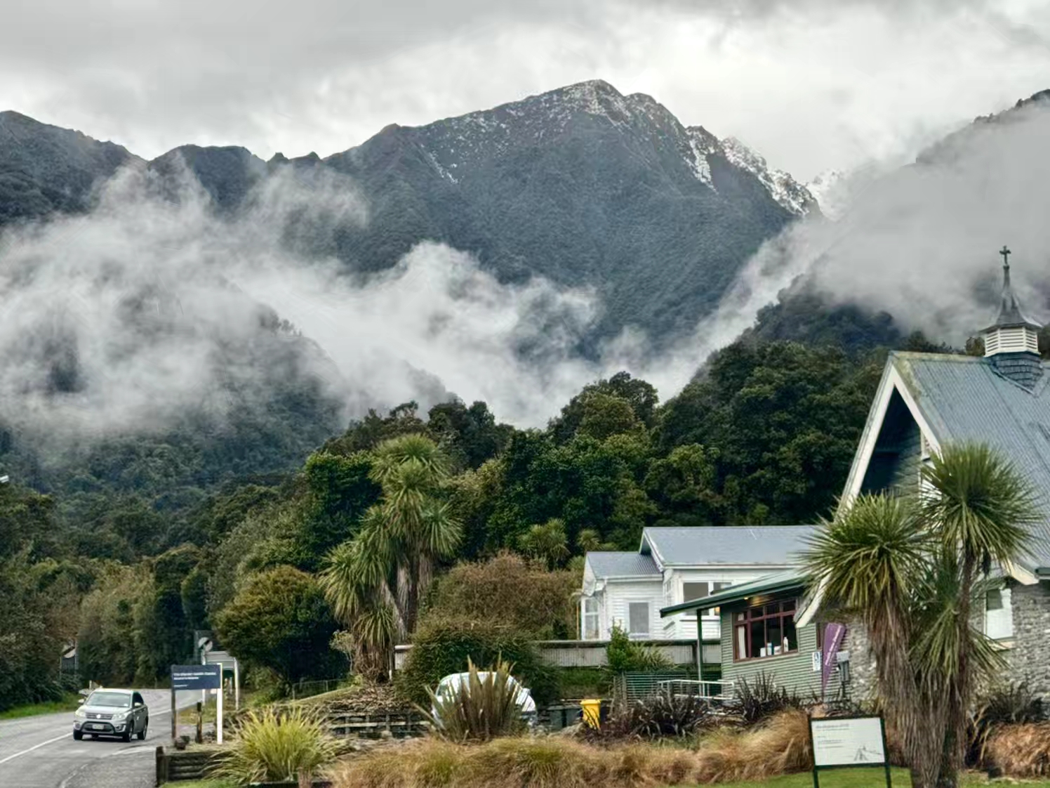 第一天就这样一路在风雨中走走停停,大约傍晚时分,我们来到了一个靠近 Fox Glacier 冰川的小村镇附近,顺势找了一家叫 Fox Glacier Lodge 的营地,安顿下来,准备第二天去徒步去看冰川,这家露营地位置还挺方便的,就在公路边上,而且还是中国人开的…