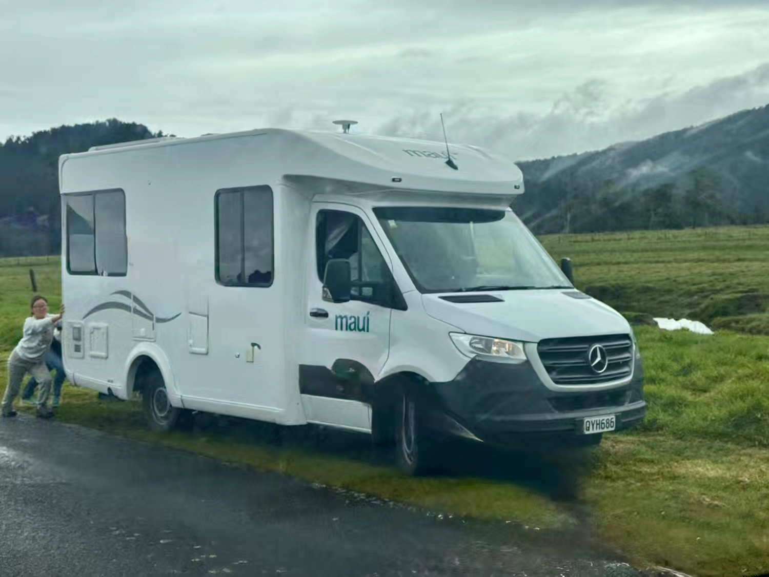 那天在路上就看到一辆中国人开的房车不小心把轮子开进了泥地里,车子直接陷住了,好几个人一起下车奋力推车,看起来有点搞笑,同时也给我们提了个醒,新西兰南岛很多路都不宽,雨天靠边停车一定要特别小心~