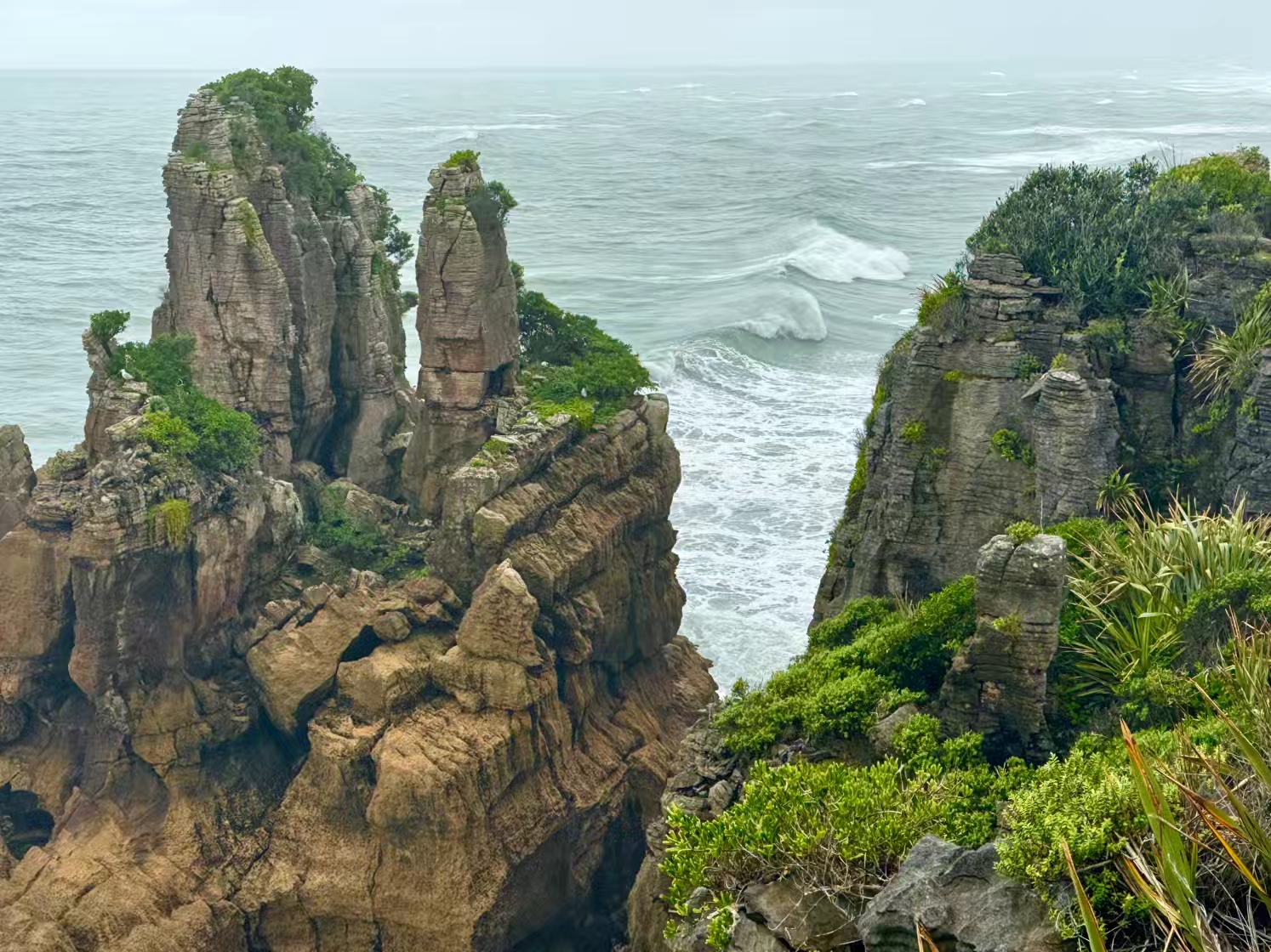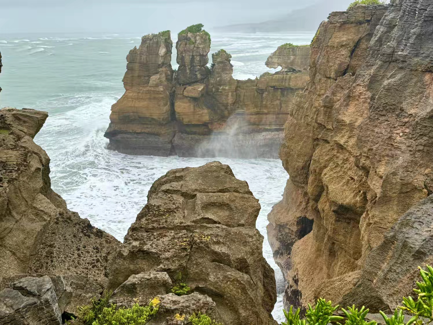 原本这是我们最期待的西岸的一处景点,可惜当时狂风大作、惊涛拍岸,瞬间再次感受到西海岸“野性之美”,浪花被风卷起,冲入岩缝间,发出震撼的轰鸣声,仿佛大地在呼吸… 想必在蓝天白云下 Pancake Rocks或许又会展现出另一种风情,层层岩石像千层饼一样堆叠在海天之间,更像是一幅温柔的风景画。而我们遇见的,则是它最狂野的样子~