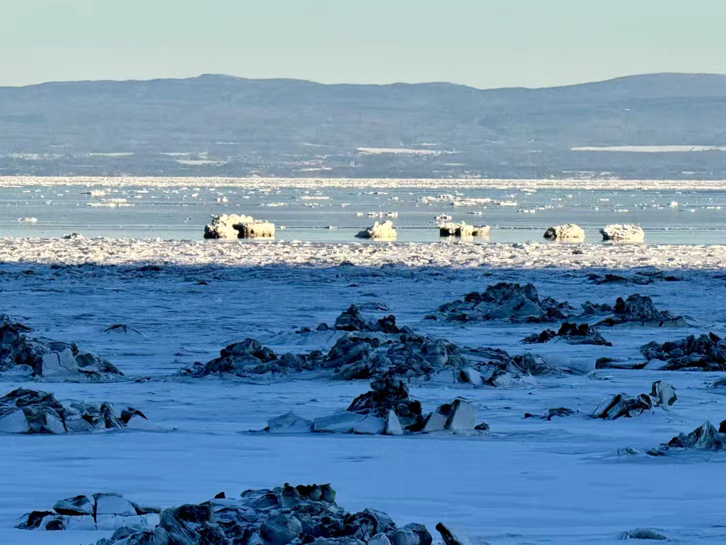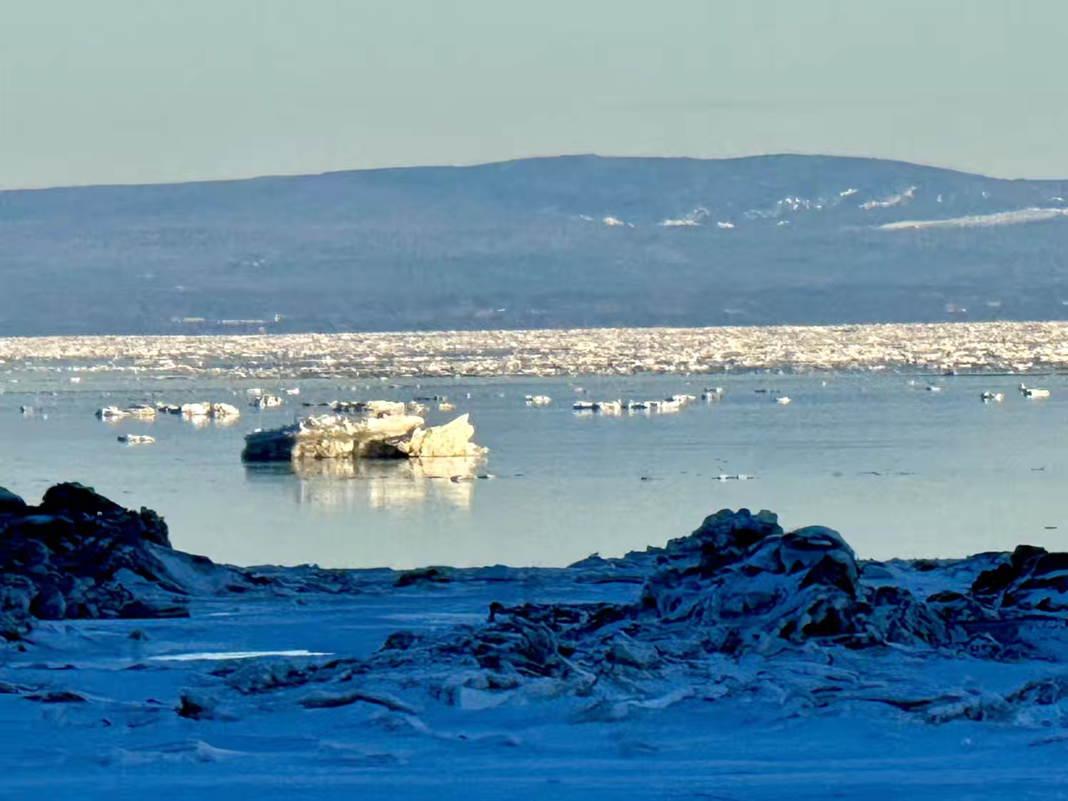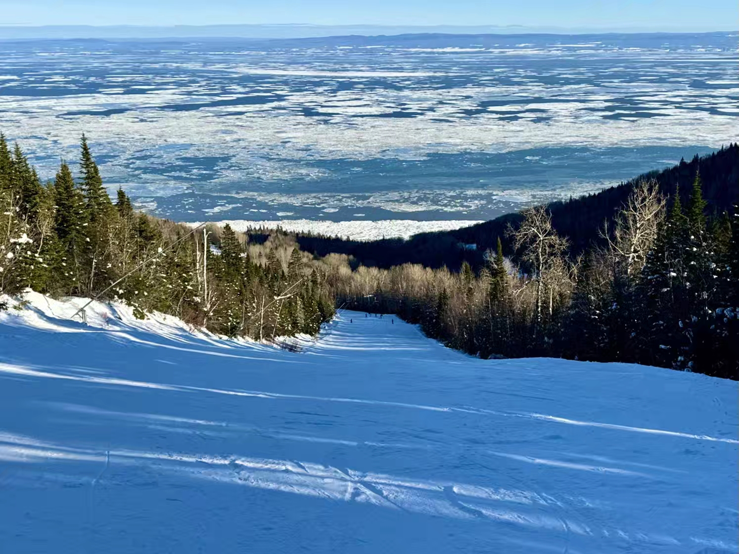 离开雪场那天,路过山脚下的圣劳伦河滨,现场观摩相当之震撼,很少在冬季如此近距离地观看冰封的圣劳伦河,那些缓缓流动的巨型浮冰,真的宛如一条冰川…