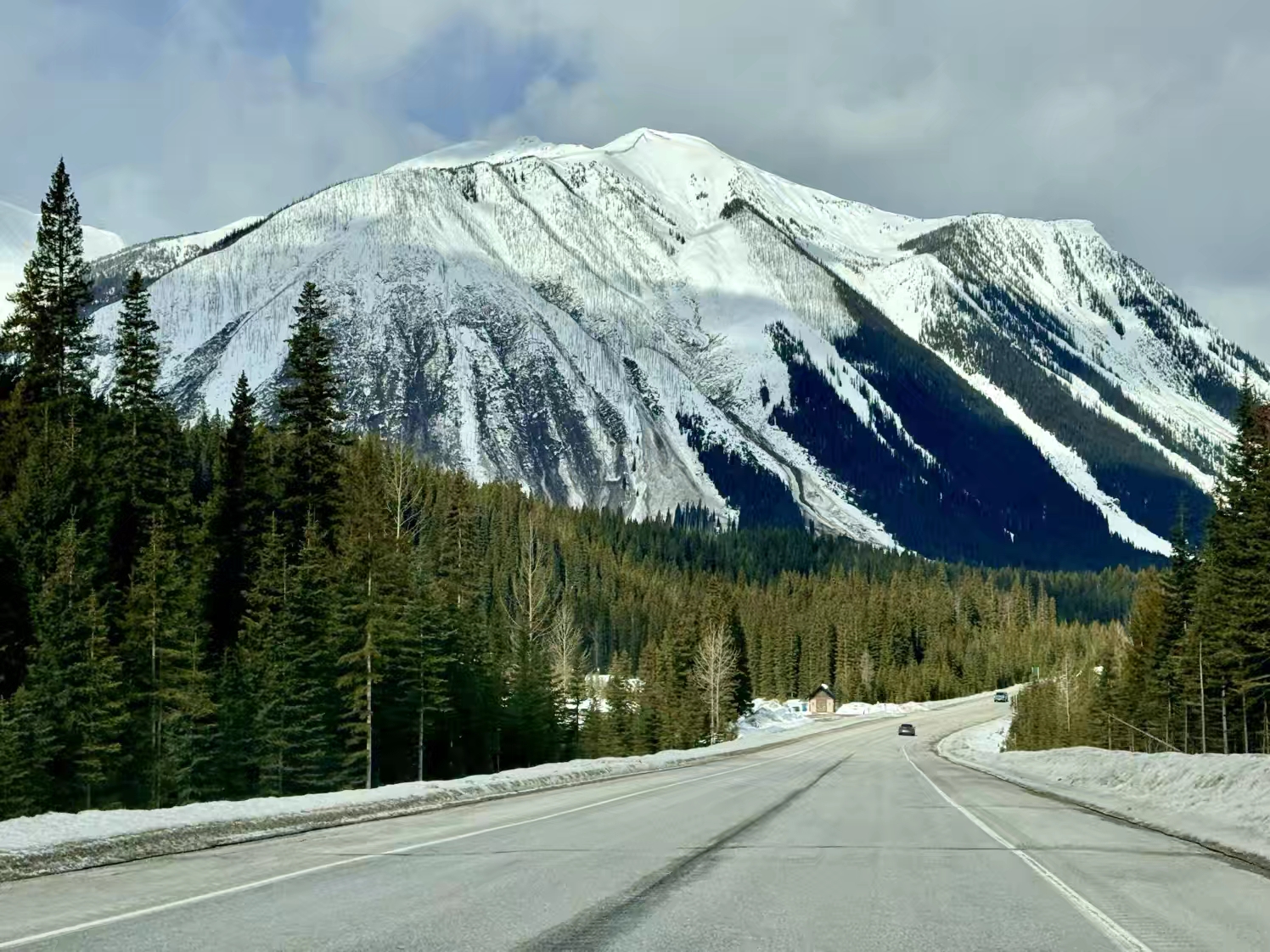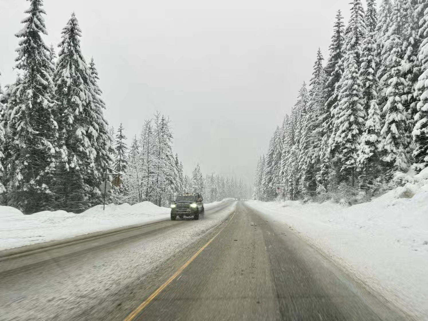 从露易丝湖去 Revelstoke 会经过幽鹤国家公园和著名的 Rogers Pass 垭口,十年前我们就从反方向自驾过一次,沿途风光优美壮观,原本挺期待看看这一段冬季的景色的,结果没想到这次遇上暴风雪,什么风景都没看到…