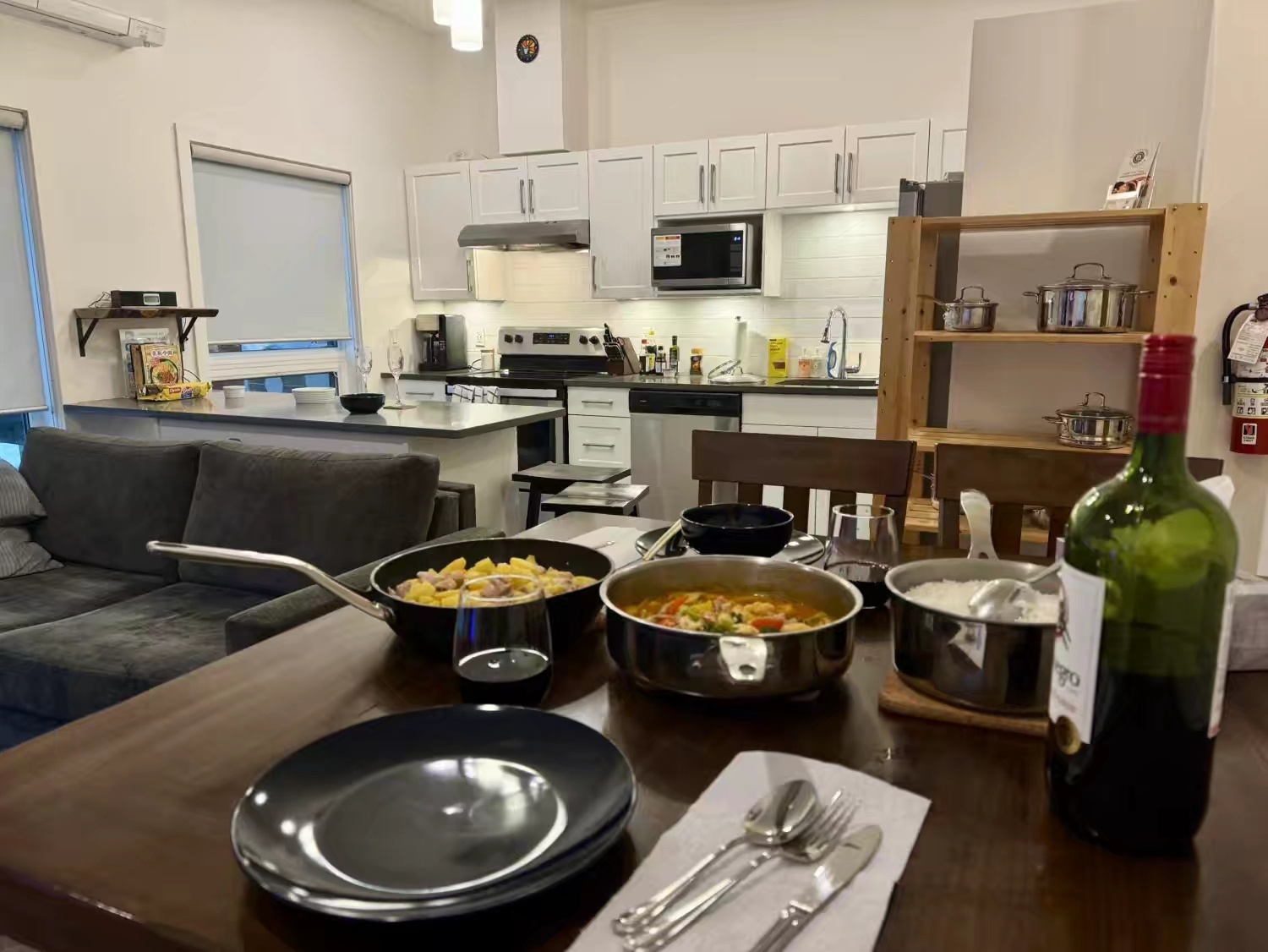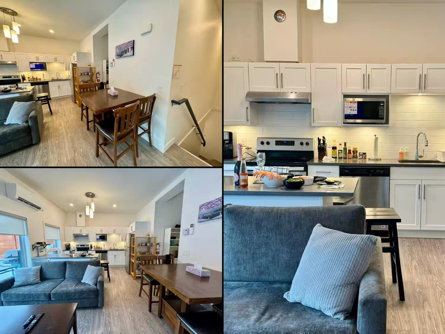 这套度假屋非常方便实用,楼下是车库,楼上是客厅、卧室和厨房等,除了烤箱、洗碗机、洗衣机、烘干机等标配,房东甚至还贴心地准备了各种厨房调料… 后来那几天天气也一般,所以我们基本上都是上山滑几轮雪,就回度假屋吃吃喝喝,看看比赛,正好也可以休整一下…