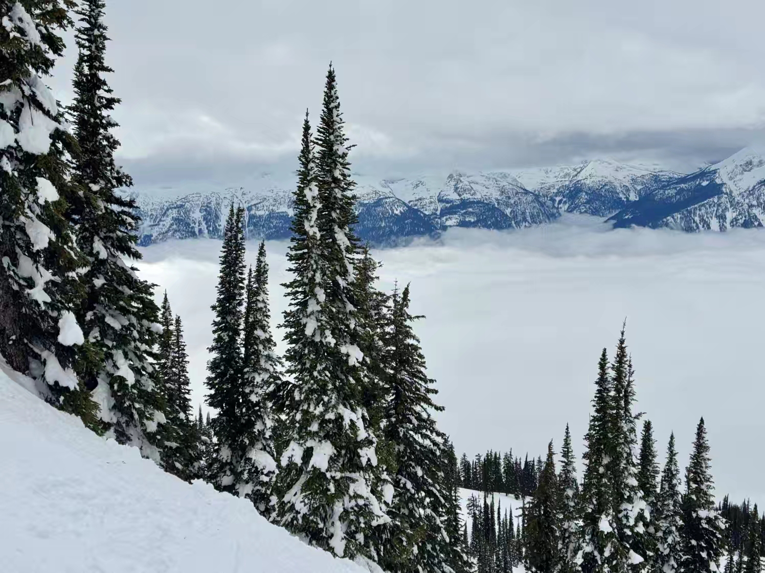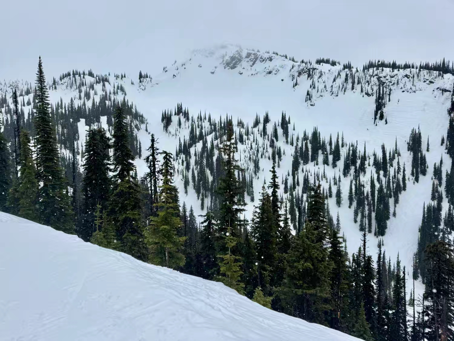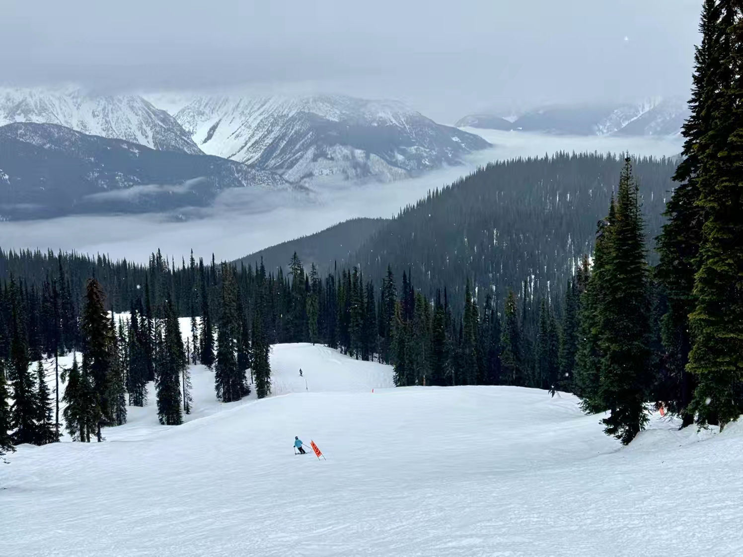 这个 Revelstoke 雪场以巨大的海拔落差而出名,垂直落差超过 1,700 米,是整个北美落差最大的雪场,同时也以难度和“粉雪天堂”著称,在露易丝湖那边体验了落基山的粉雪后,我们还在想,这里的雪会粉成什么样子,本来非常期待来这里感受一下那种“粉雪天花板”的感觉,可没想到,来到这里之后,却遇上了这趟行程里最不理想的雨雪天气,整个就是山下在下雨,山顶在下湿雪…