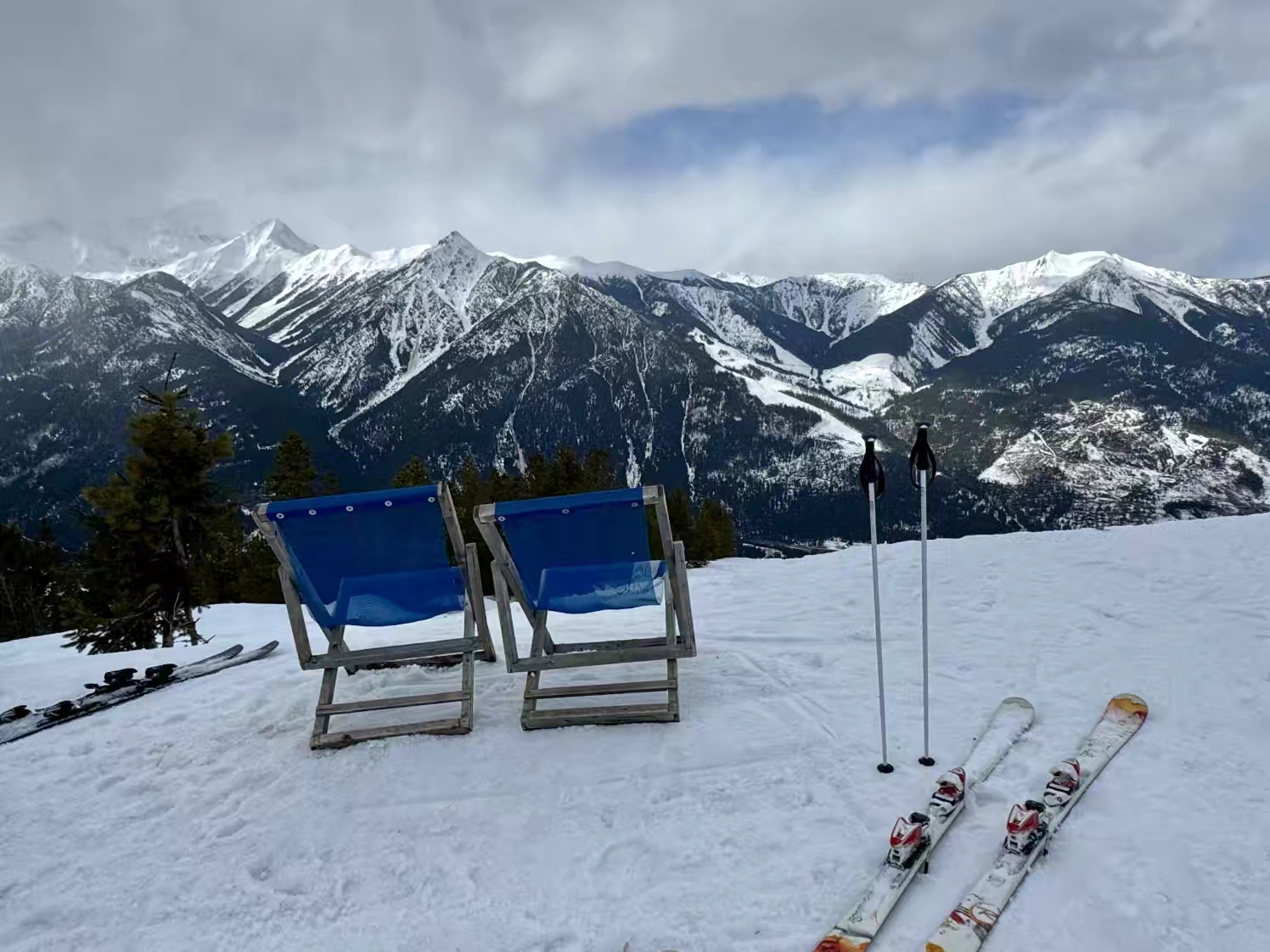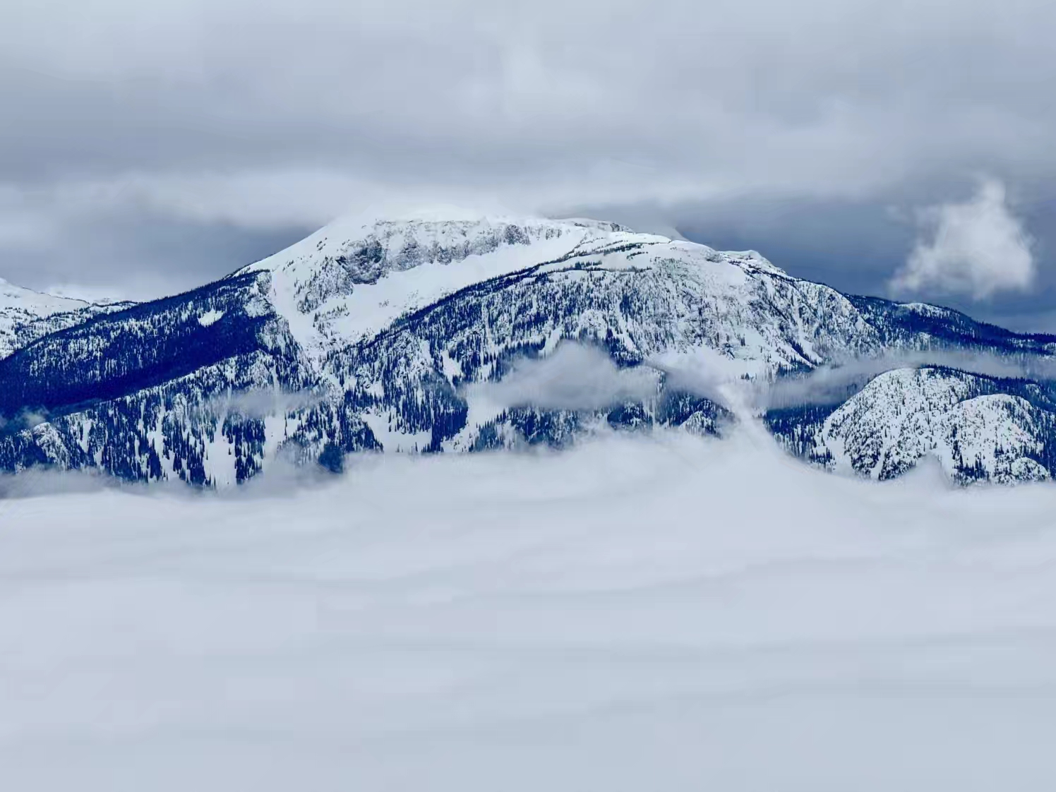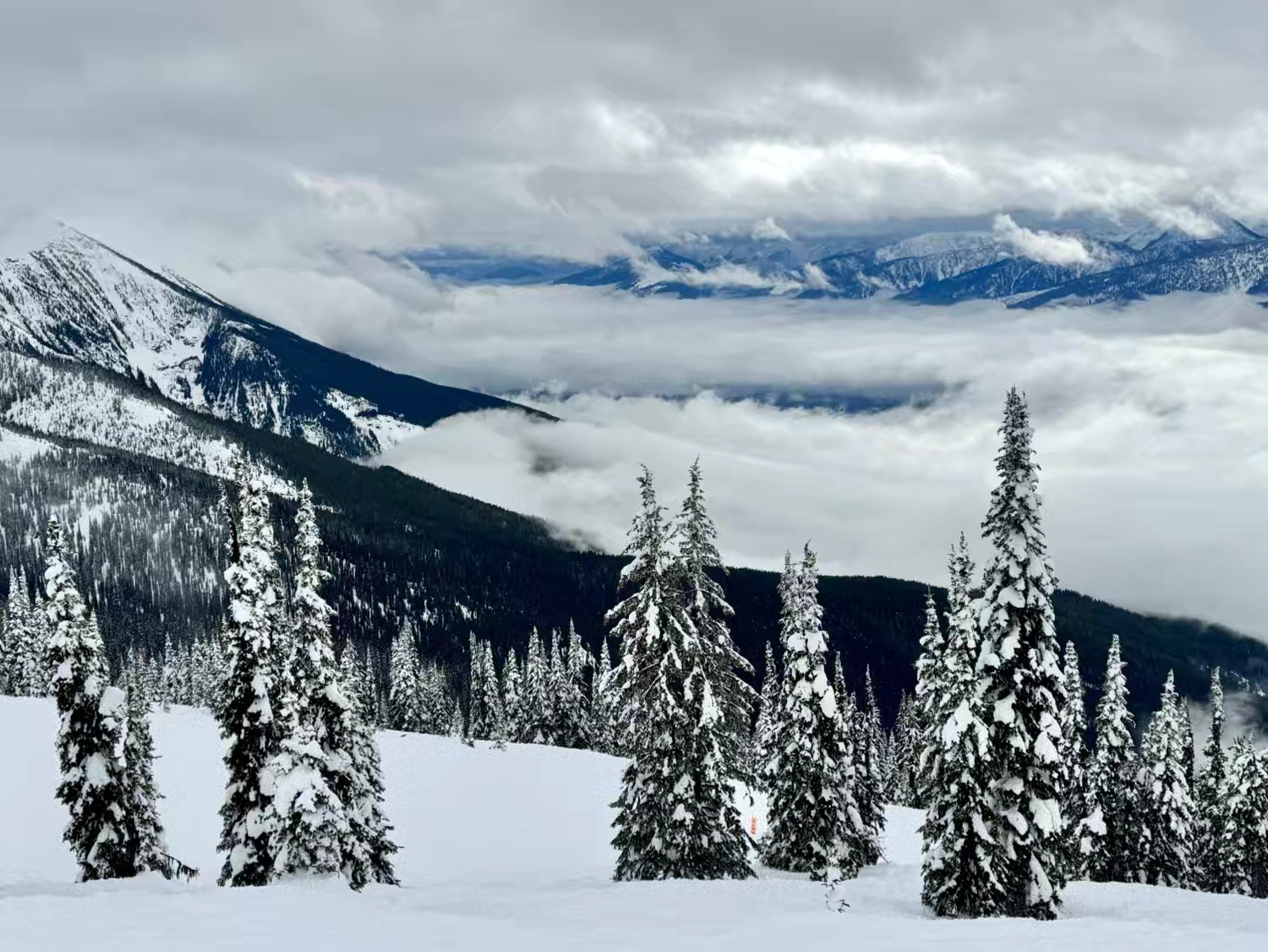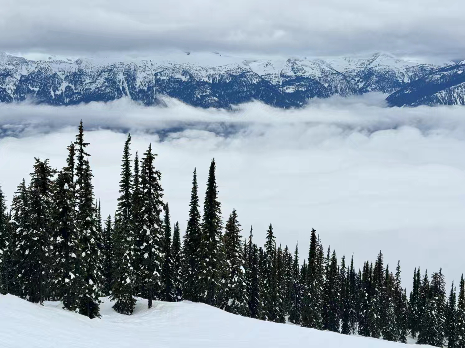 这个 Revelstoke 雪场以巨大的海拔落差而出名,垂直落差超过 1,700 米,是整个北美落差最大的雪场,同时也以难度和“粉雪天堂”著称,在露易丝湖那边体验了落基山的粉雪后,我们还在想,这里的雪会粉成什么样子,本来非常期待来这里感受一下那种“粉雪天花板”的感觉,可没想到,来到这里之后,却遇上了这趟行程里最不理想的雨雪天气,整个就是山下在下雨,山顶在下湿雪…