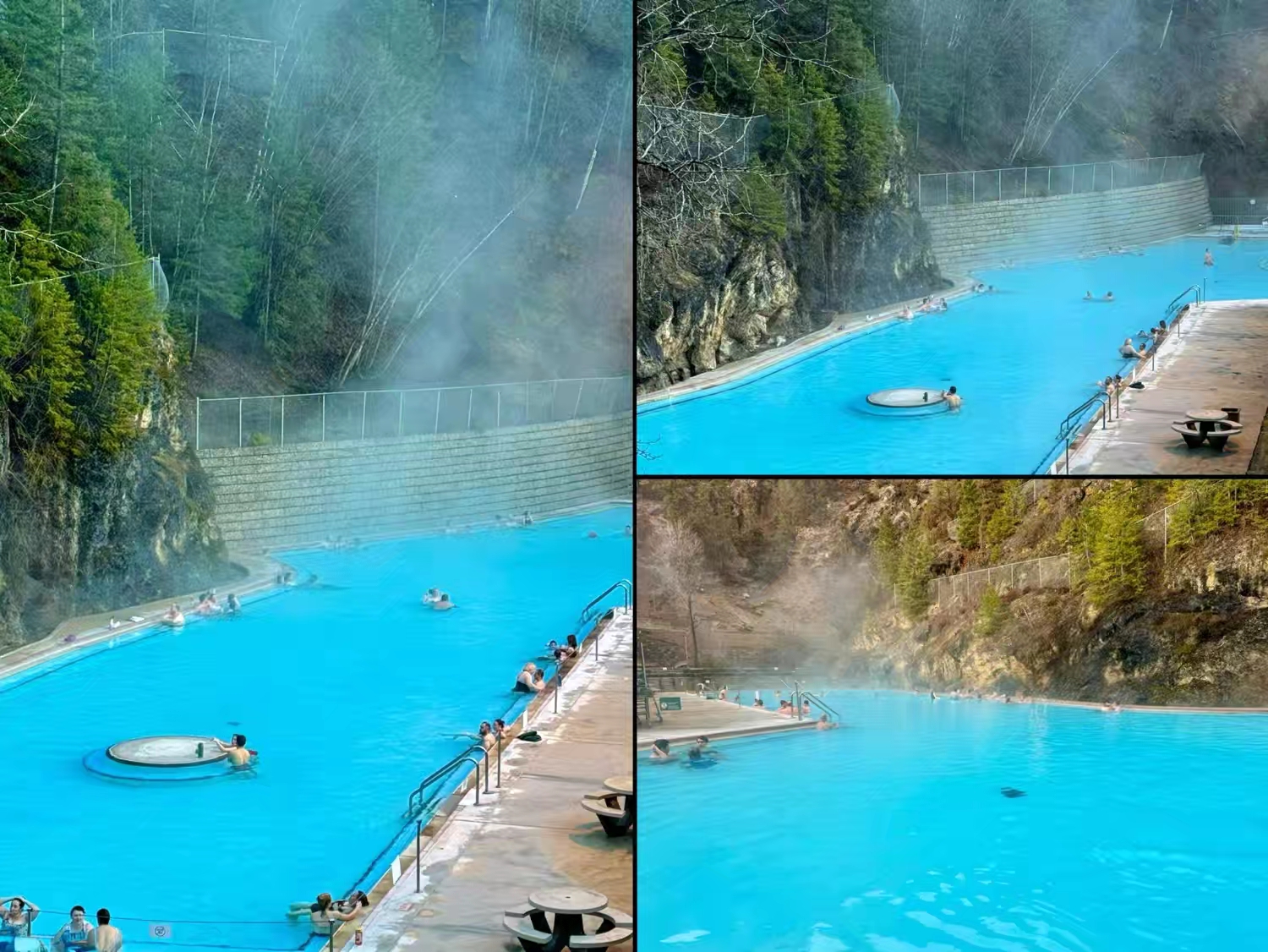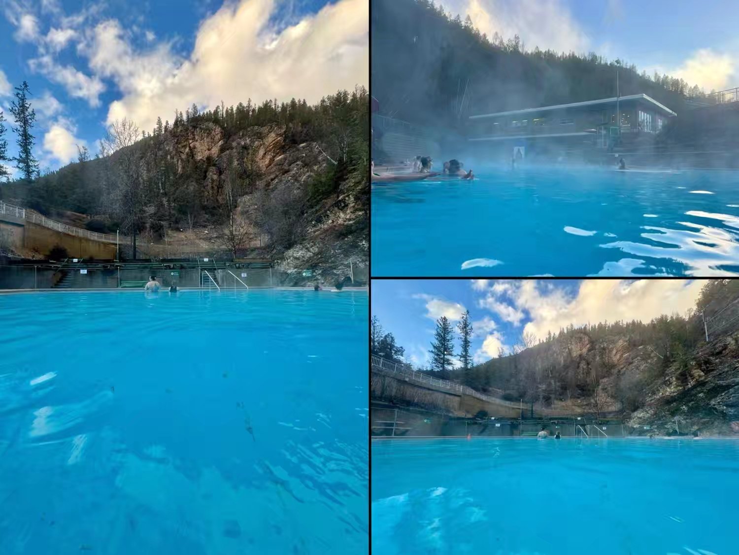 而当天绕了一圈开了一整天的车,最大的奖励就是,抵达目的地前到隐藏在山谷里的一个天然 Hot Spring泡温泉,简直太解乏了,这个叫 Radium 的 Hot Springs位于Panorama滑雪场附近,隐藏在山谷中,是落基山最有名的天然温泉之一,令我们想起冰岛那个著名的蓝湖,但这里感觉更原始一点,我们泡着温泉,还看到了对面悬崖上有大角羊在觅食 :)