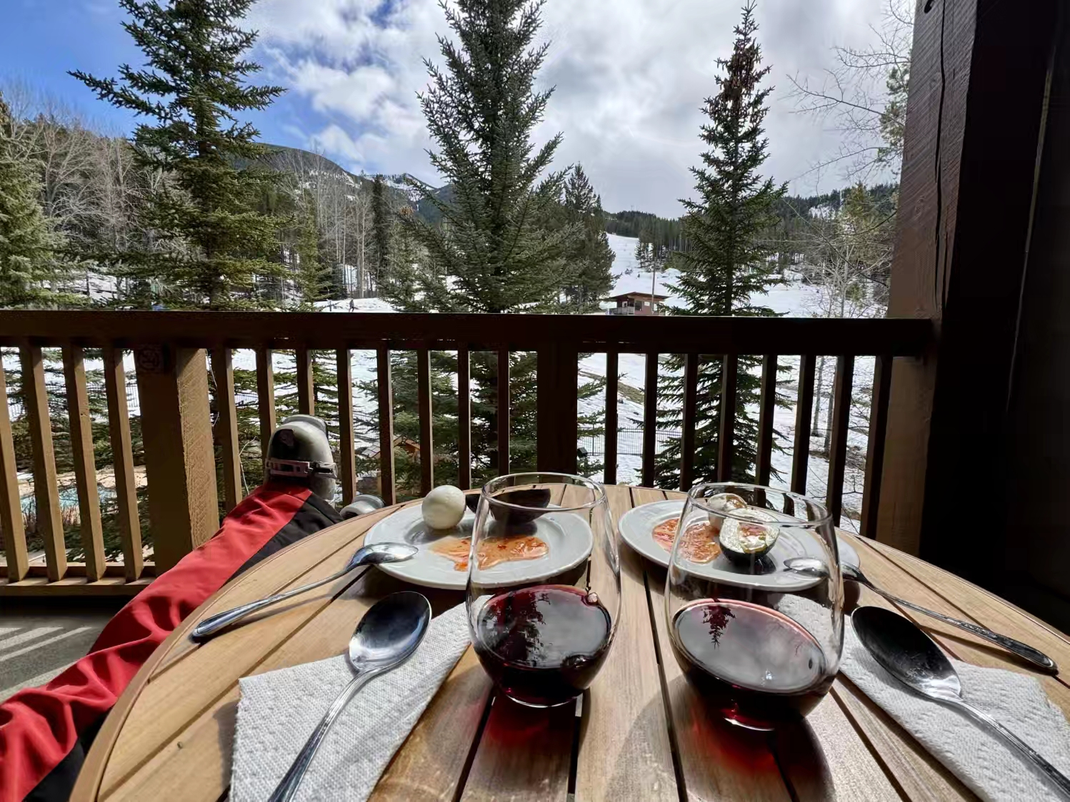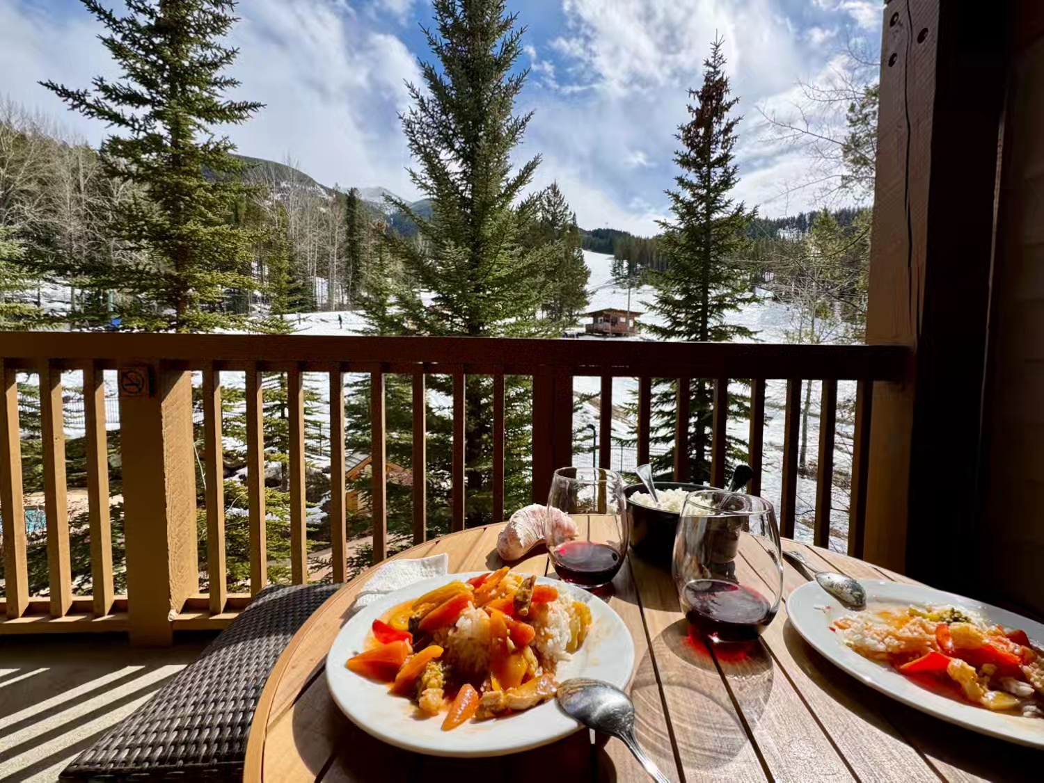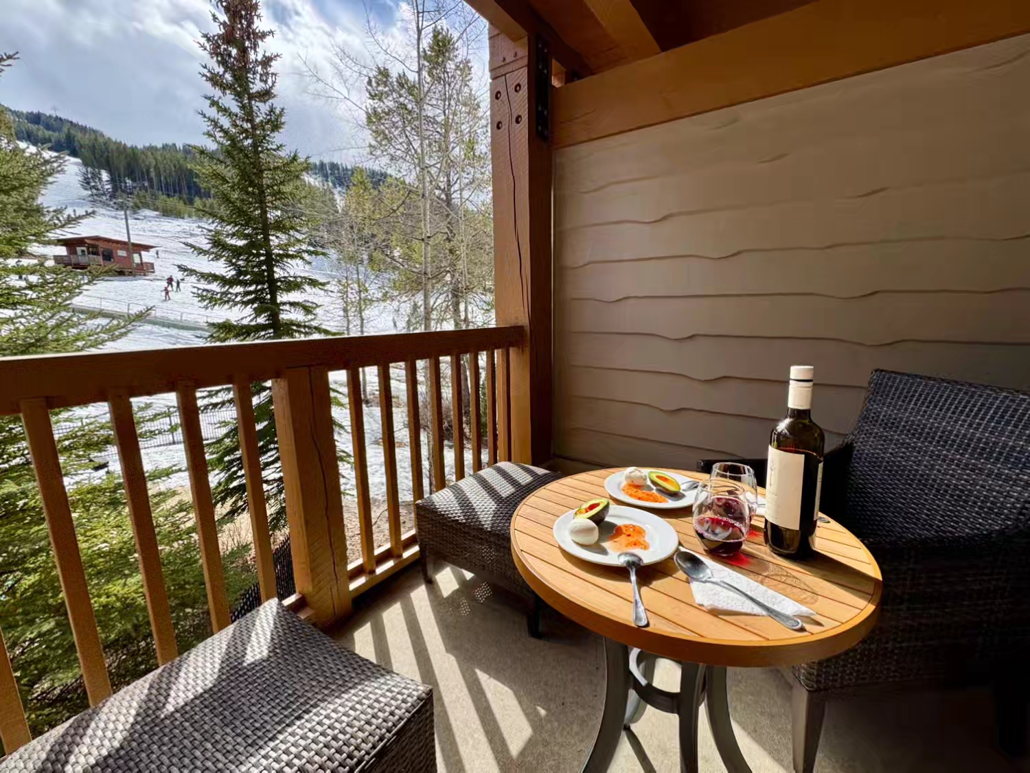 滑了小半天的雪,直接滑回度假村公寓吃个简单的户外午餐,BC省这边真的比阿省那边温暖很多,在露台上边晒着太阳,边吃边喝,惬意至极~ 话说BC省 Okanagan Valley 出产的红酒,品质相当不错,新世界红酒同样可以让人惊艳…