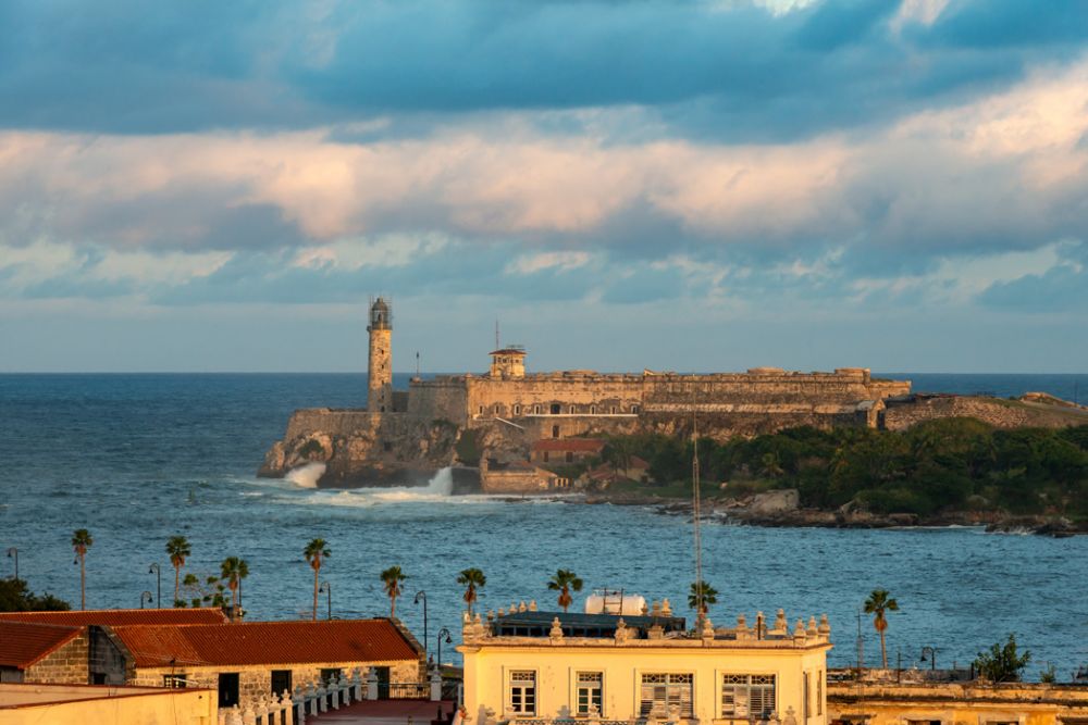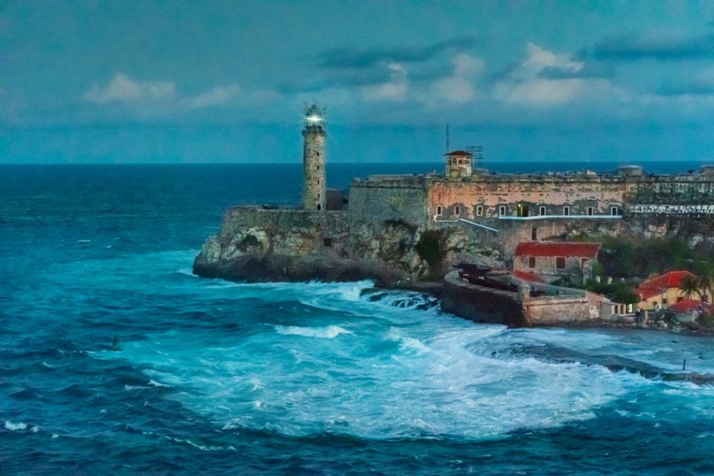 游轮一早到达哈瓦那湾的港口,顺水道进入港湾,水道两旁一边有两座防御要塞,一共4座堡垒扼守要道,西班牙人修来防止海盗打劫的,东面的第一座堡垒叫三王莫罗堡(Castillo De los Tres Reyes del Morro),“莫罗”是西班牙语“石头”的意思,西属殖民地到处都建有莫罗堡。天不见亮,莫罗堡的灯塔灯光闪耀