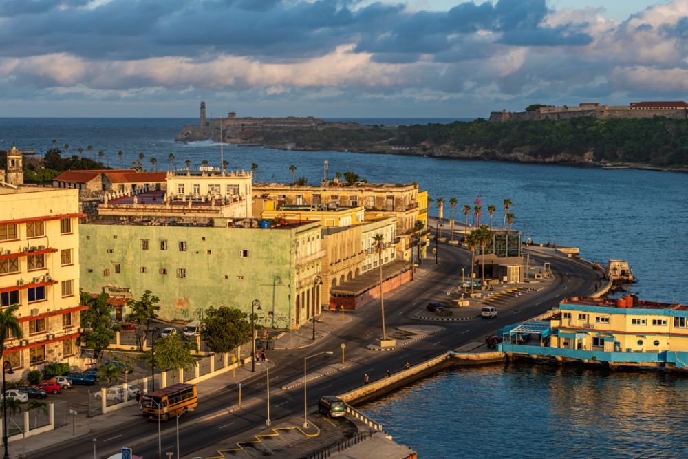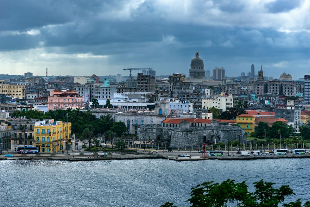 两岸之间的水道地底下有隧道可通行汽车。我们一早就在顶层甲板上看游轮进港,天上云层很厚,呈现蓝调,间或有发红的云朵,甲板上又碰到那位古巴裔老太,她跟游客激动地讲述她家故事,说她叔叔还在哈瓦那,就住在市区她手指的那个方向。