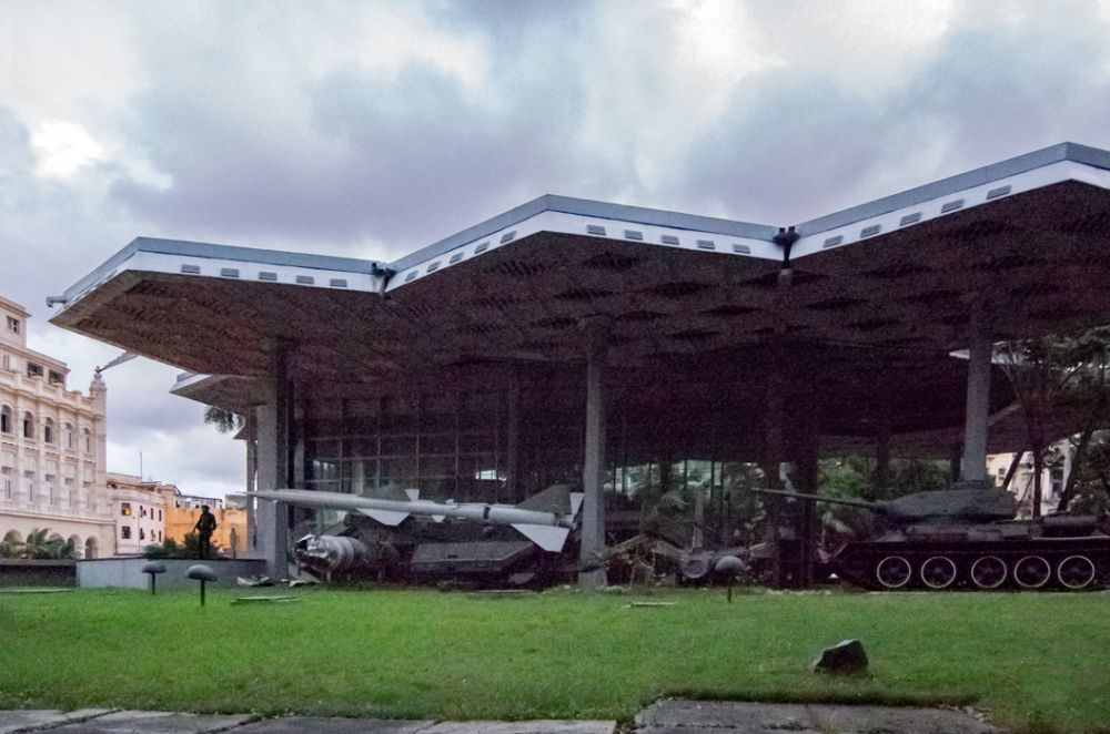 上午就这样过去了,大巴拉我们去吃中饭,路过革命纪念馆,玻璃房子里供奉着卡斯特罗和切.格瓦拉等闹革命时从墨西哥杀回古巴的游艇“Granma“,传闻卡斯特罗等开国革命家一共80多人挤在这艘游艇上过海,而游艇等正常载人数是24人,这段子使我想起父辈关于当年红军能飞檐走壁的传闻。周围草地上摆放着飞机,大炮等武器,美式坦克是缴获的。