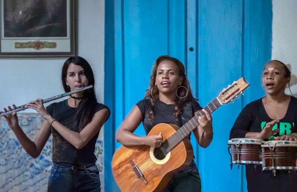 大巴将我们拉到附近一座古要塞旁,古要塞现在成了警察局和军校的地盘,进不去。餐厅就在古要塞对过的大街上,宅子很气派,国家旅游部门的门面,里面是个很大的天井,典型西班牙式建筑,天井四四方方的,栽种着花草,走廊很宽敞,摆满了桌椅,靠走廊的房间都是一家家销售纪念品工艺品的小店。走廊上一共摆了几十桌,客人大多是大巴拉来的团游老美,一看就是船上的,老头老太居多,大胖子居多。饭菜是三道,前菜,主菜和饭后甜品,菜品吃后无多大印象,印象最为深刻的是桌上每人一杯的朗姆酒饮品,朗姆酒可是古巴一绝,有老美问,招待说是3年的Havana Club。尽管饮品中朗姆酒已经被大幅度稀释了,喝到嘴里还是有股浓郁的酒香味,喝完后并不上头,确实不凡。对面餐桌前有几个古巴女子在吹拉弹唱挣小费,她们演奏完一首曲子就换一桌,还没等到她们换到我们桌前我们团就开拔了。