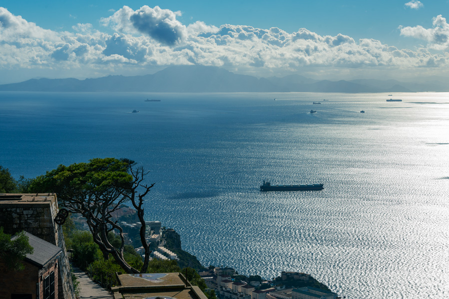 在岩山之巅俯瞰海峡,南望非洲大陆,直布罗陀船运公司每天轮渡船穿过海峽,连结大海彼岸的摩洛哥丹吉尔城,每天有不少摩洛哥人来直布罗陀倒货,坐渡轮把东西带到海对面的坦吉尔,烟,酒和电器是他们采购的重点,在直布罗陀这些是免税品,回去一倒卖就可以小赚一笔。