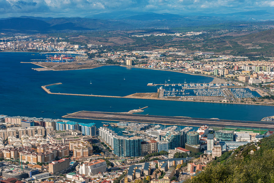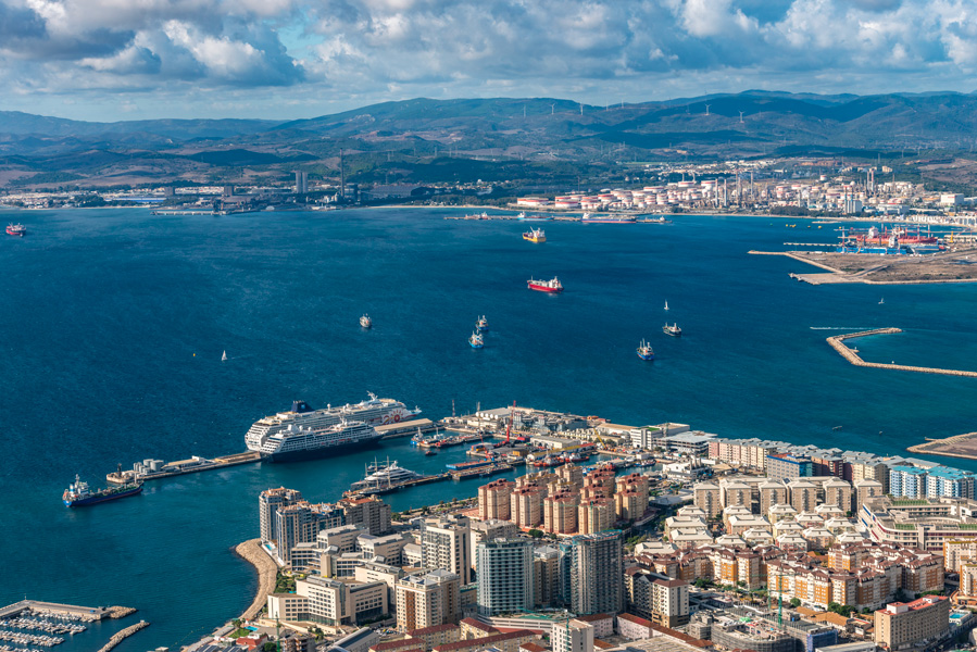 直布罗陀面积只有区区6平方公里,分老城和新城,不断填海造地,新城不断扩大。港口附近就是高楼大厦林立的新城,是最现代化最靓丽的地方,赌场、高档购物中心、豪华度假村和高档公寓都在这一带,直布罗陀已经从一个军事要地蜕变成了旅游度假胜地。游轮港口的西面便是西班牙的阿尔赫西斯港(Algeciras),北面是与直布罗陀接壤的拉利尼亚(La Linea)港,西班牙开发了这些港口跟直布罗陀竞争,许多商船泊在这3个海湾里。近处就是直布罗陀海港,游轮静泊在码头。