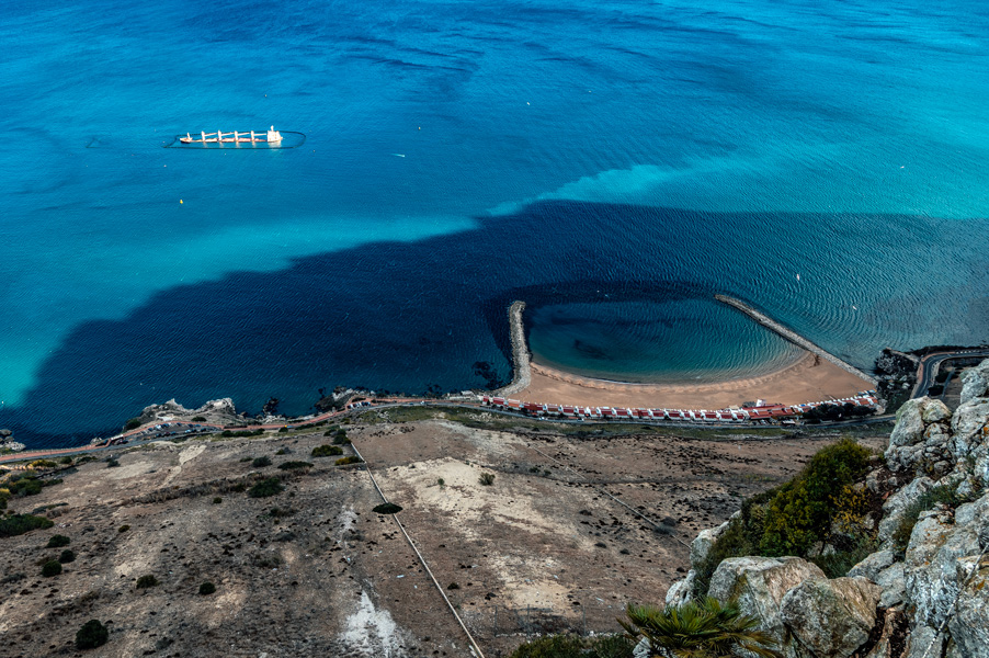 原以为游轮进入地中海时能以最佳角度拍岩山,但是清晨进港没拍成。游轮晚上起航前往地中海城市马拉加,在海上天已经黑透了,根本看不清楚岩山的尖头。
