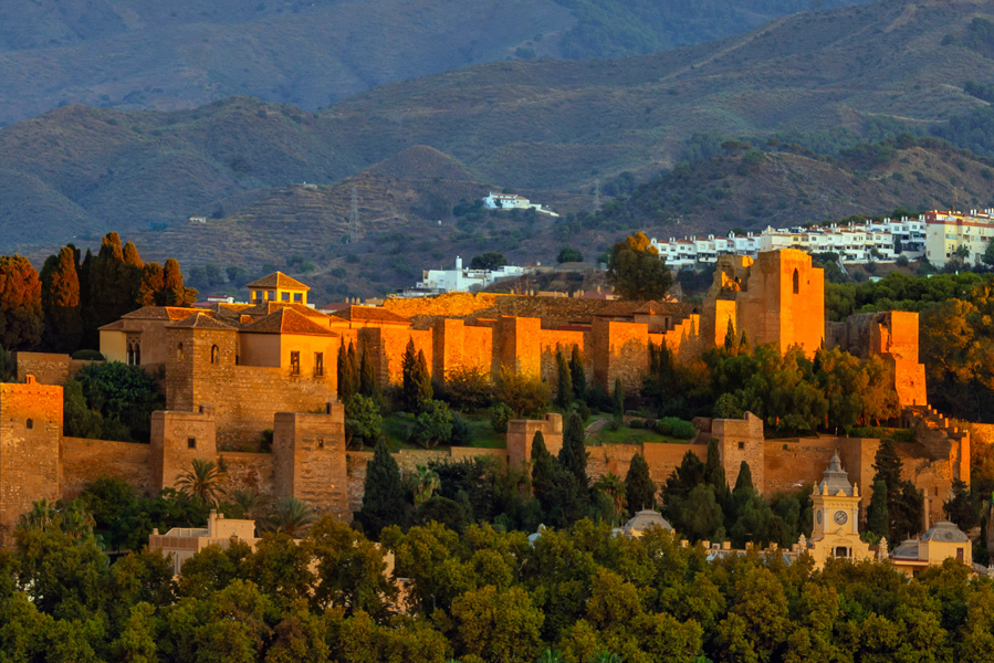 清晨从游轮顶层看晨光中的马拉加阿尔卡扎城堡(Alcazaba)