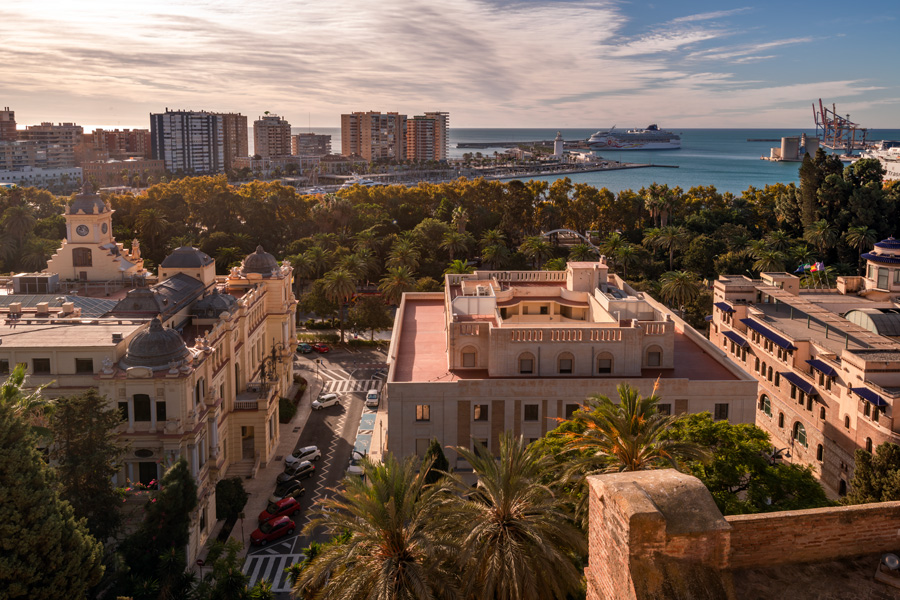 从城堡可以眺望码头游轮,俯瞰着海港和市中心。下面的建筑是马拉加大学。