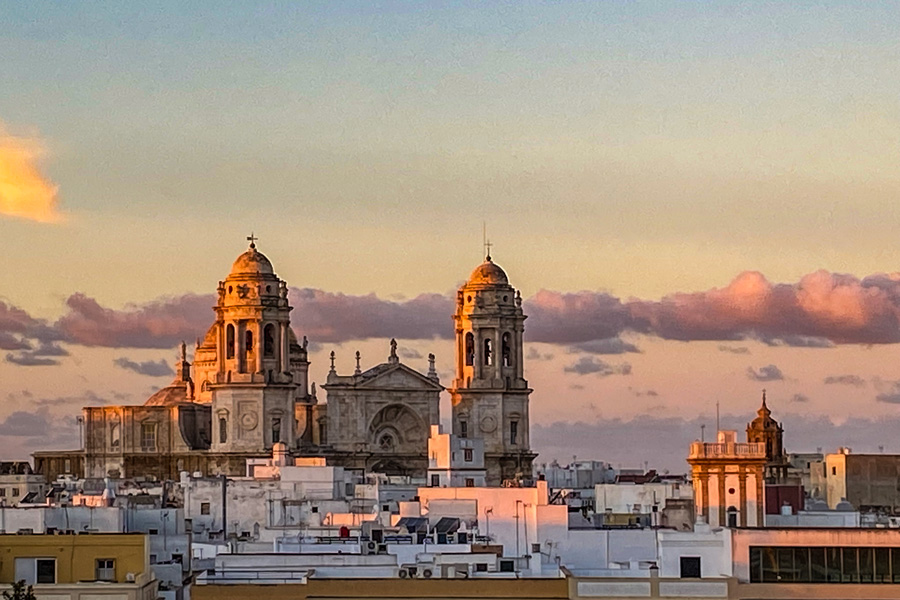 清晨进港时,朝阳把卡迪斯大教堂的高耸的钟楼染红。
