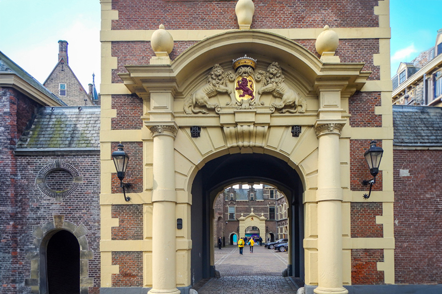 海牙Plein广场旁边的国会大楼(Binnenhof),是座十三世纪建立的城堡。自1446年起,它升格为荷兰国会开会之所,也是荷兰皇室所在地。所以海牙是名副其实的皇城,是许多世纪以来荷兰的政治中心。我们去时里面大部分建筑围起来了,在修缮。