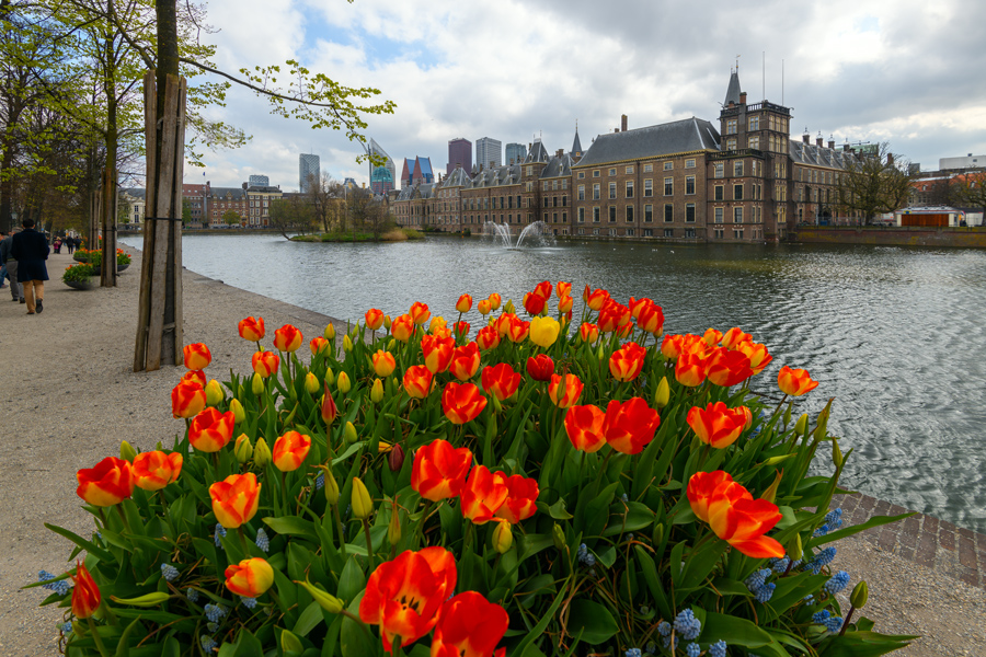 霍夫菲法湖 (Hofvijver)中有小岛和喷泉,湖畔的花坛开满了郁金香,水灵灵的。