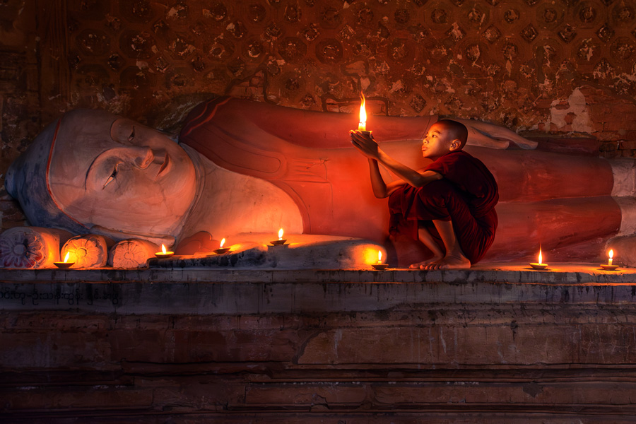 我们仿佛忘记了时空,看到散落的佛光在窗隔里若隐若现,看到黑暗中出现了一条通往天际的窄道。我们找到了让人心动的瞬间,小僧弥为佛点燃蜡烛,耳畔隐约听到佛在说:“一花一世界,一叶一如来”。