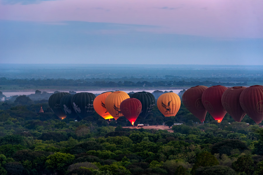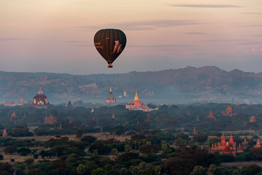 在蒲甘的最后一天清晨,我们到了一处高地拍日出,霞光把雾染成金黄色的轻纱,披在塔身。热气球升起后,有的高高飘在蒲甘平原的上空,有的低低掠过灌木草丛中数不尽的佛塔。我们附近的塔无从知其姓名,按珠珠的说法,是草根佛塔,它们数量最多,散落在蒲甘芒草遍地、雾尘弥漫的大平原上。也许每座塔都有一个故事,也许每座塔都是一个期盼,却再也不会有人知晓。仍然,当万籁俱寂的大地慢慢变得明亮,树冠间的薄雾绕着古塔飘荡,群鸟惊飞,我们有种荡涤灵魂的感动。