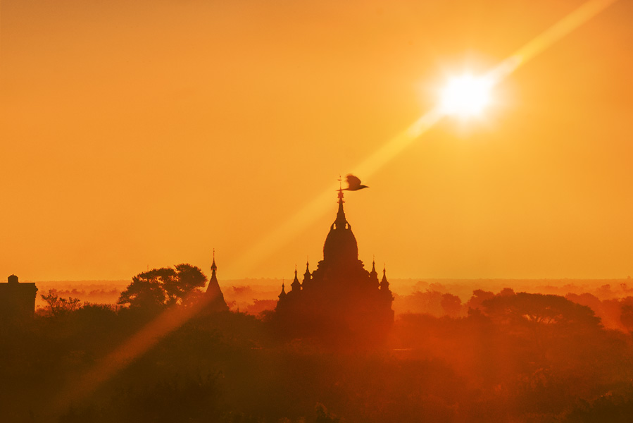 不过天空中没有热气球点缀,似乎少了些内容。从观光塔上看的话,太阳升起的方向和蒲甘众多佛塔以及热气球升空的方向是相反的,所以看日出就只能单纯看日出,根本看不到朝阳从著名众塔群中升空的景象,也拍不到空中气球与朝阳同框,这就是观景塔地理位置不好之处。